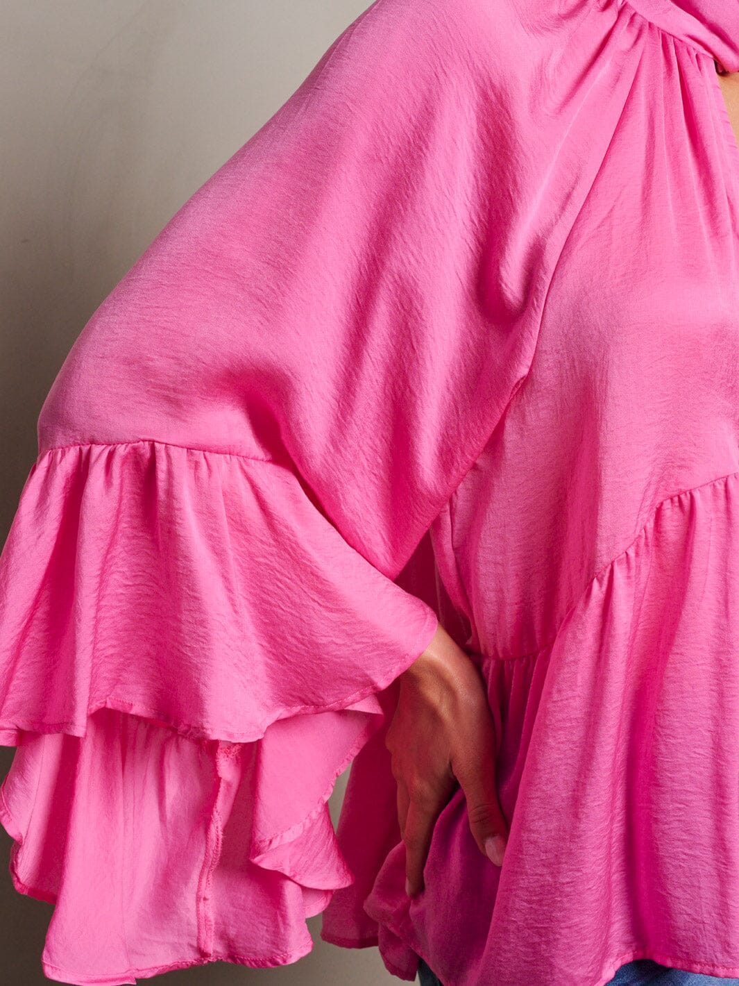 Features:Lightweight 100% polyester fabric, flattering v-neckline, feminine ruffle detailing, long sleeves, versatile styling options, perfect for any season, a must-have for fashion boutiques.
