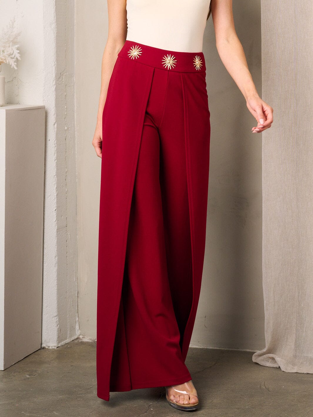 95% polyester, 5% spandex blend for ultimate comfort and stretch. Wide leg silhouette that is both on-trend and flattering. Sun detailing on waist adds a unique touch. Available in multiple sizes for a wide range of customers. Easy to style with a variety of tops and accessories. Perfect for both casual and dressier occasions. Made in China for reliable quality and production.
