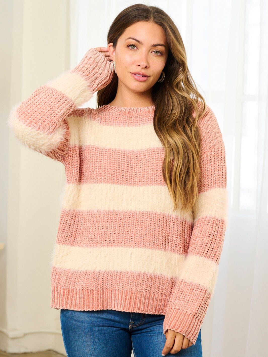 Complete the look:Our striped colorblock sweater is a staple piece that's gaining traction among boutique owners. Its attractive pricing and high markup potential make it a lucrative option for wholesale buyers, while its enduring style ensures it remains a frequent reorder favorite. Perfectly suited for both in-store displays and online fashion showcases, this sweater's trend appeal and versatile design promise to capture the attention of savvy shoppers.