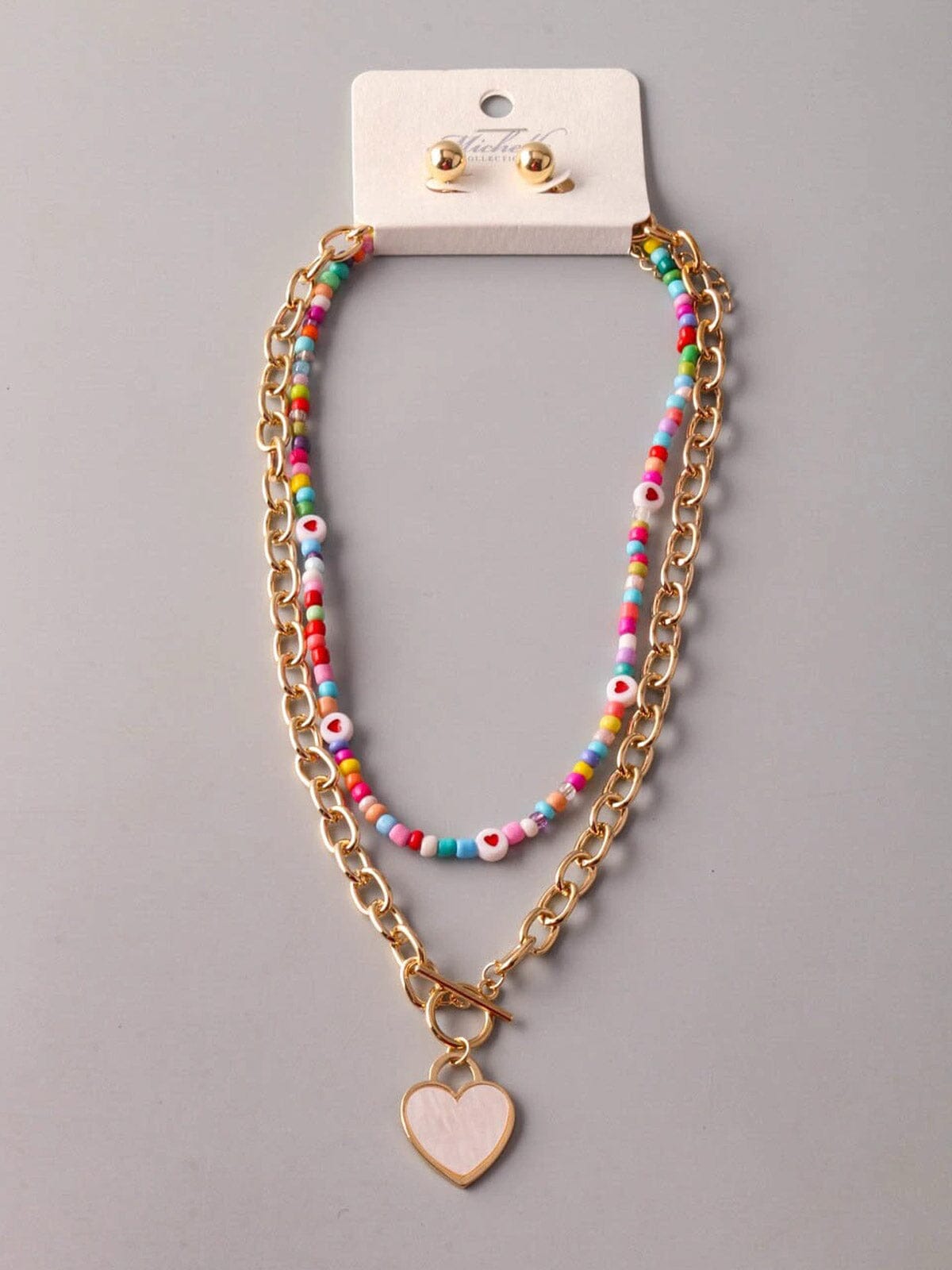 FASHION STUDS EARRINGS & HEART PENDANT CHAINS NECKLACE SET
