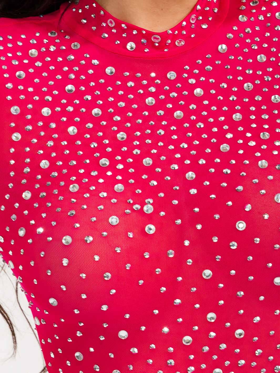 Features:Elegant bodycon fit, mock neck design, studded detail for added flair, ideal for evening wear, comfortable polyester-spandex blend, trend-forward design, perfect for seasonal collections.