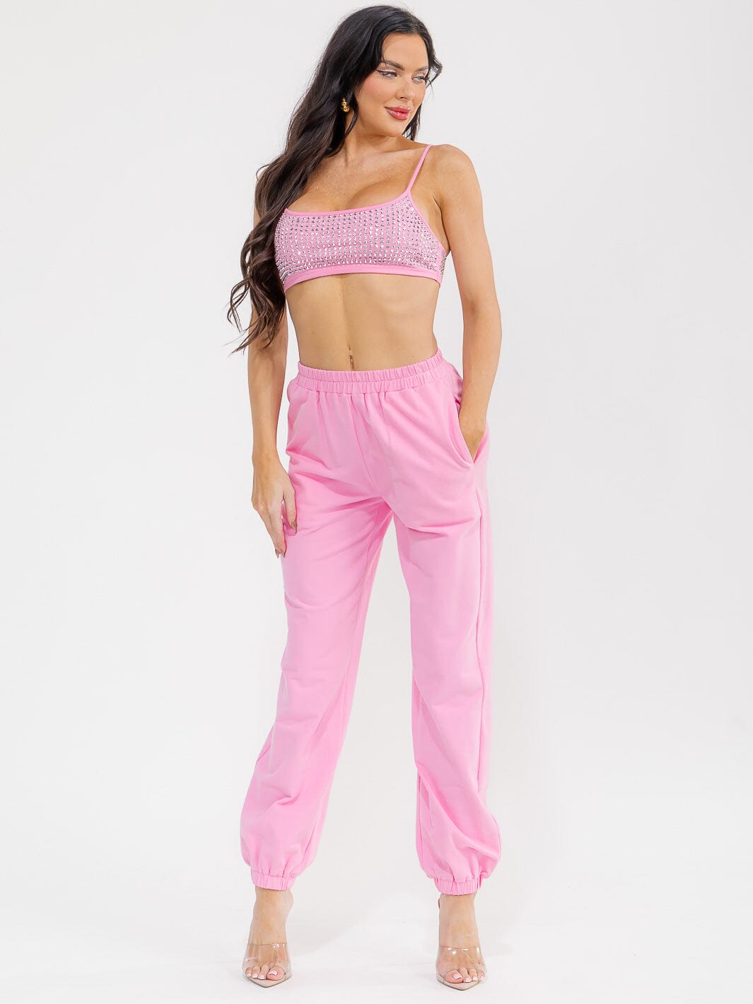 WOMEN'S SLEEVELESS CROP TOP & ELASTIC WAIST PANTS STUDS DETAILED 2PC. SET