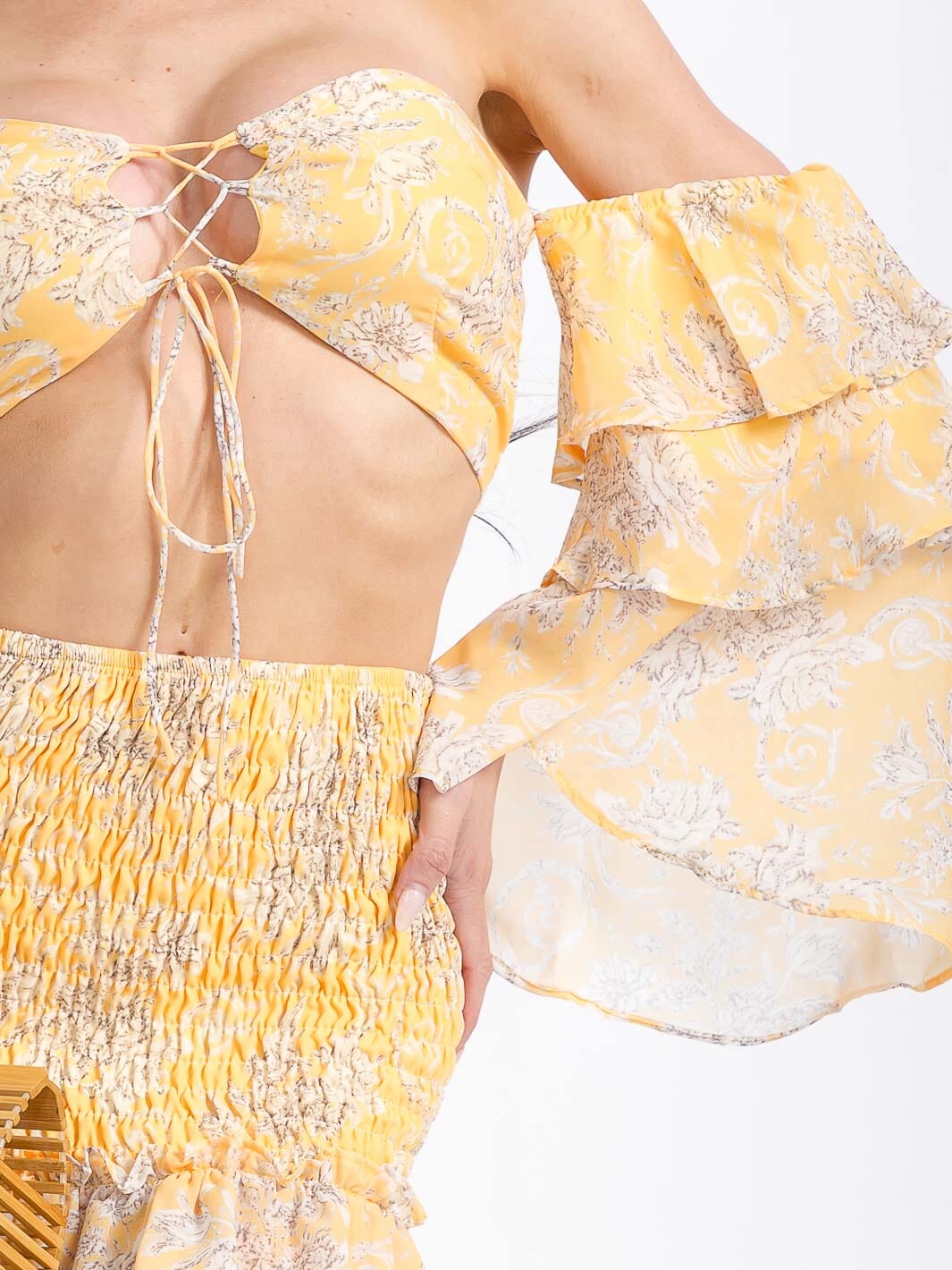WOMEN'S RUFFLE SLEEVES CROP TOP & SMOCK MINI SKIRT FLORAL 2PC. SET