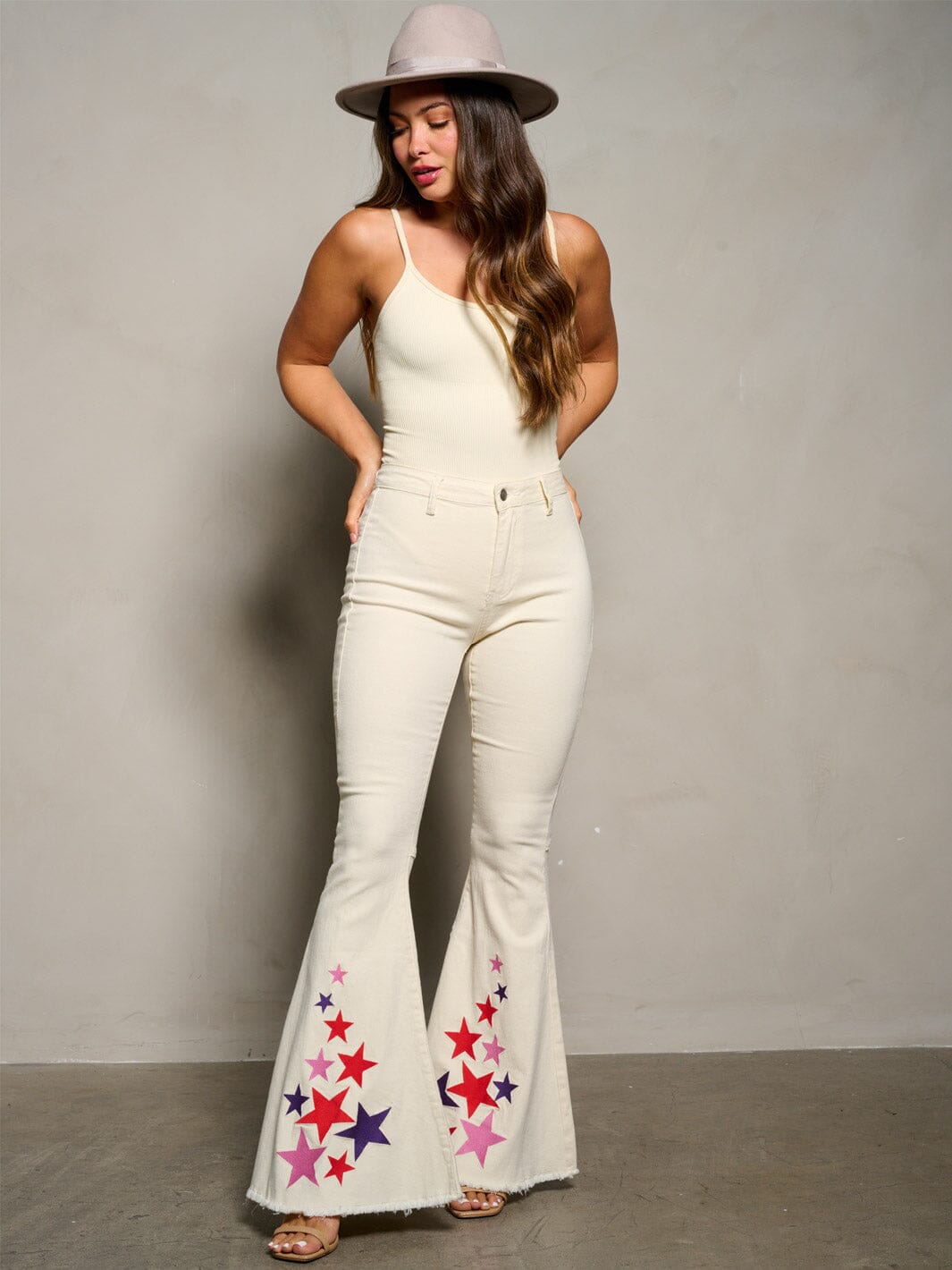 Elevate your denim game with these stylish and versatile bell leg pants. Featuring a trendy stars print and a flattering button closure, these pants are the perfect addition to any fashion-forward wardrobe. Whether you're heading to brunch, a resort getaway, or just running errands, these pants will keep you looking chic and feeling comfortable all day long.