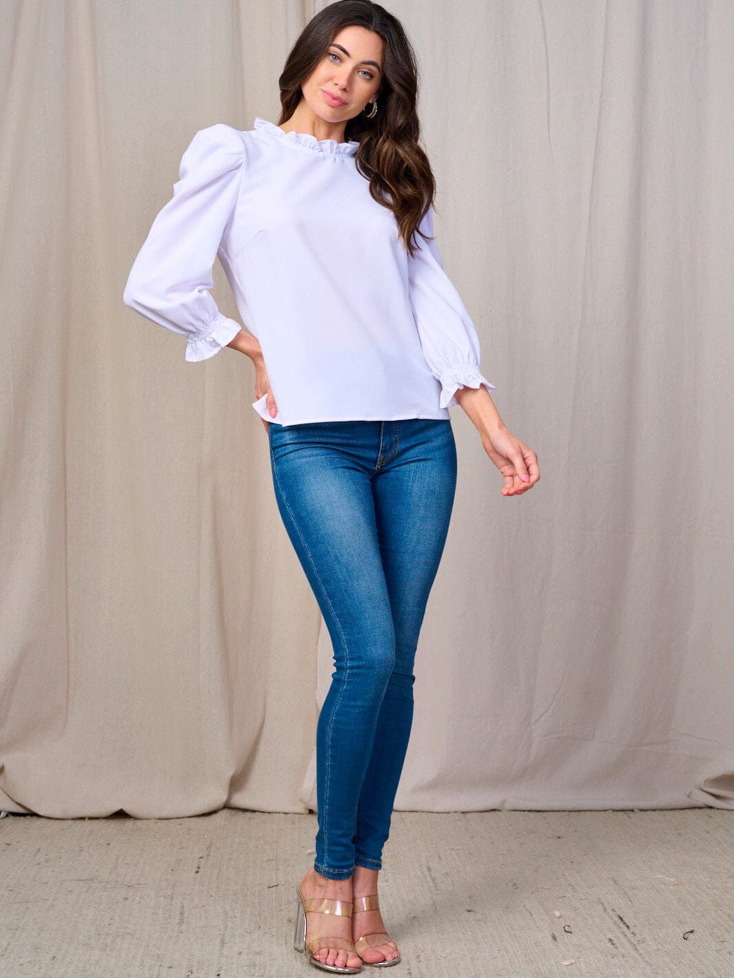 Elevate your wardrobe with this versatile and stylish top. Featuring long puff sleeves, a ruffle-trimmed neckline, and a flattering silhouette, this blouse is perfect for any occasion. Whether you're heading to brunch or vacationing at a resort, this top will keep you comfortable and looking chic. Made with breathable and high-quality fabric, it's a must-have layering piece for any boutique.