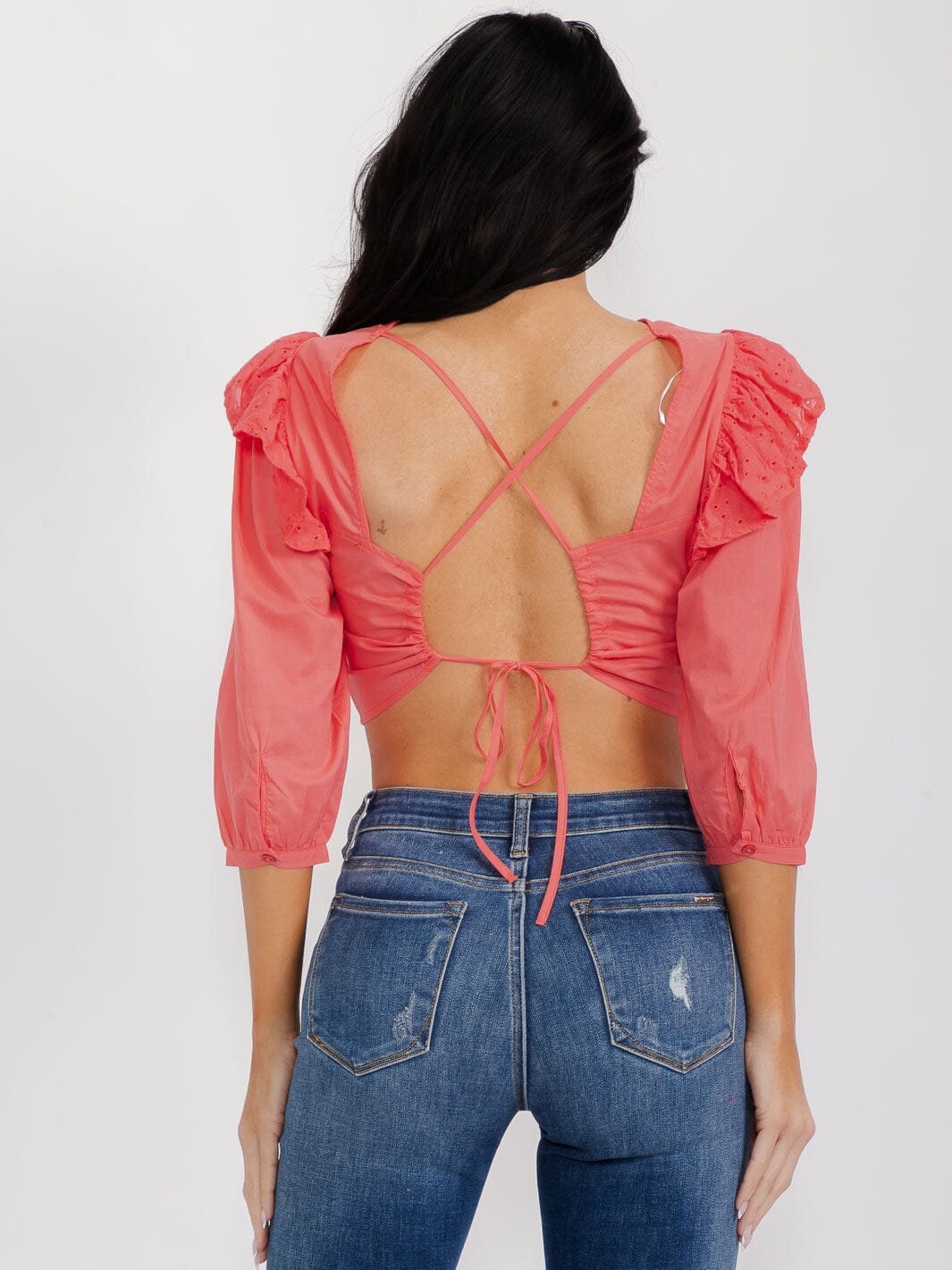 Looking for the perfect addition to your boutique's summer collection? Look no further than this effortlessly chic crop top. With its 3/4 sleeves, open back, and ruffle eyelet design, this top is a must-have for any fashion-forward boutique owner. Whether you're headed to brunch, a resort vacation, or just want a casual yet stylish look, this versatile piece has got you covered. Not only is it flattering and breathable, but it's also the perfect layering piece for any outfit. Trust us, your customers will love it!
