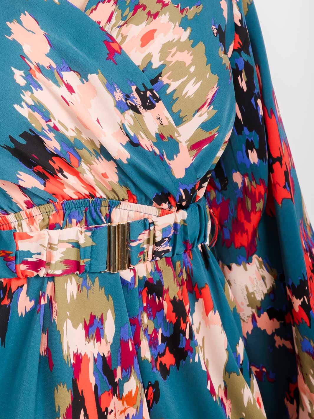 WOMEN'S LONG SLEEVE SURPLICE BELTED MULTI PRINT MINI DRESS