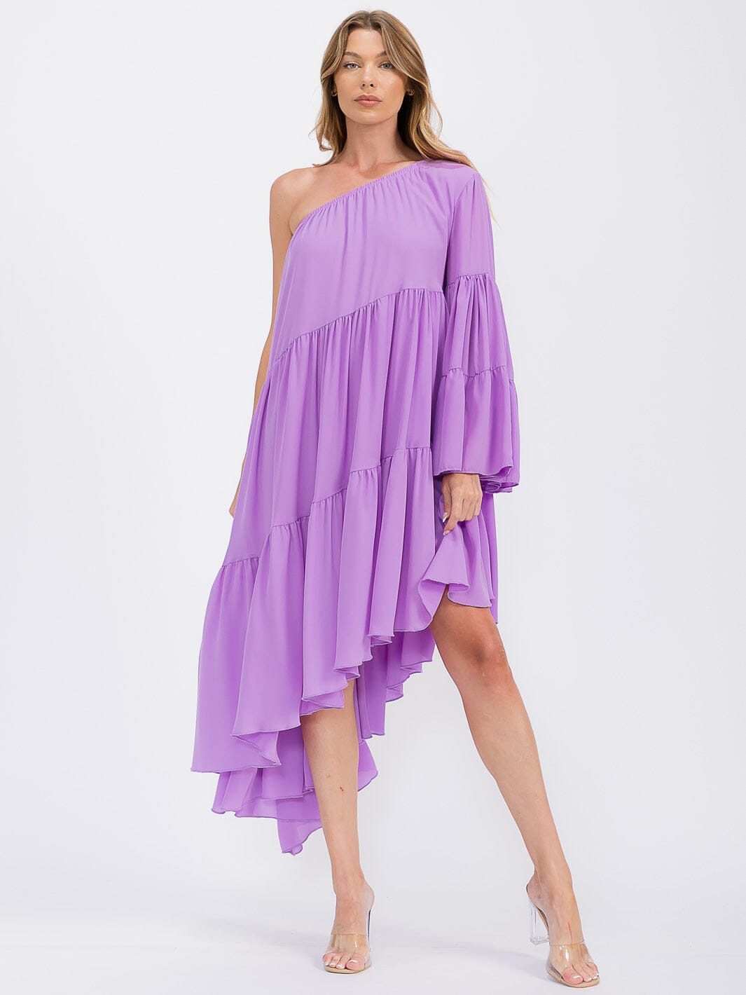 The Women's One-Shoulder Long Sleeve Pockets Tiered High-Low Midi Dress is a must-have for retailers. Its trendy yet versatile design makes it a bestseller with boutiques, and the comfortable fabric and practical pockets make it a customer favorite. As a wholesale buyer, you can rely on this dress to be a consistent reorder item. With its attractive markup potential and eye-catching display value, this dress is a great investment for your boutique's collection.
