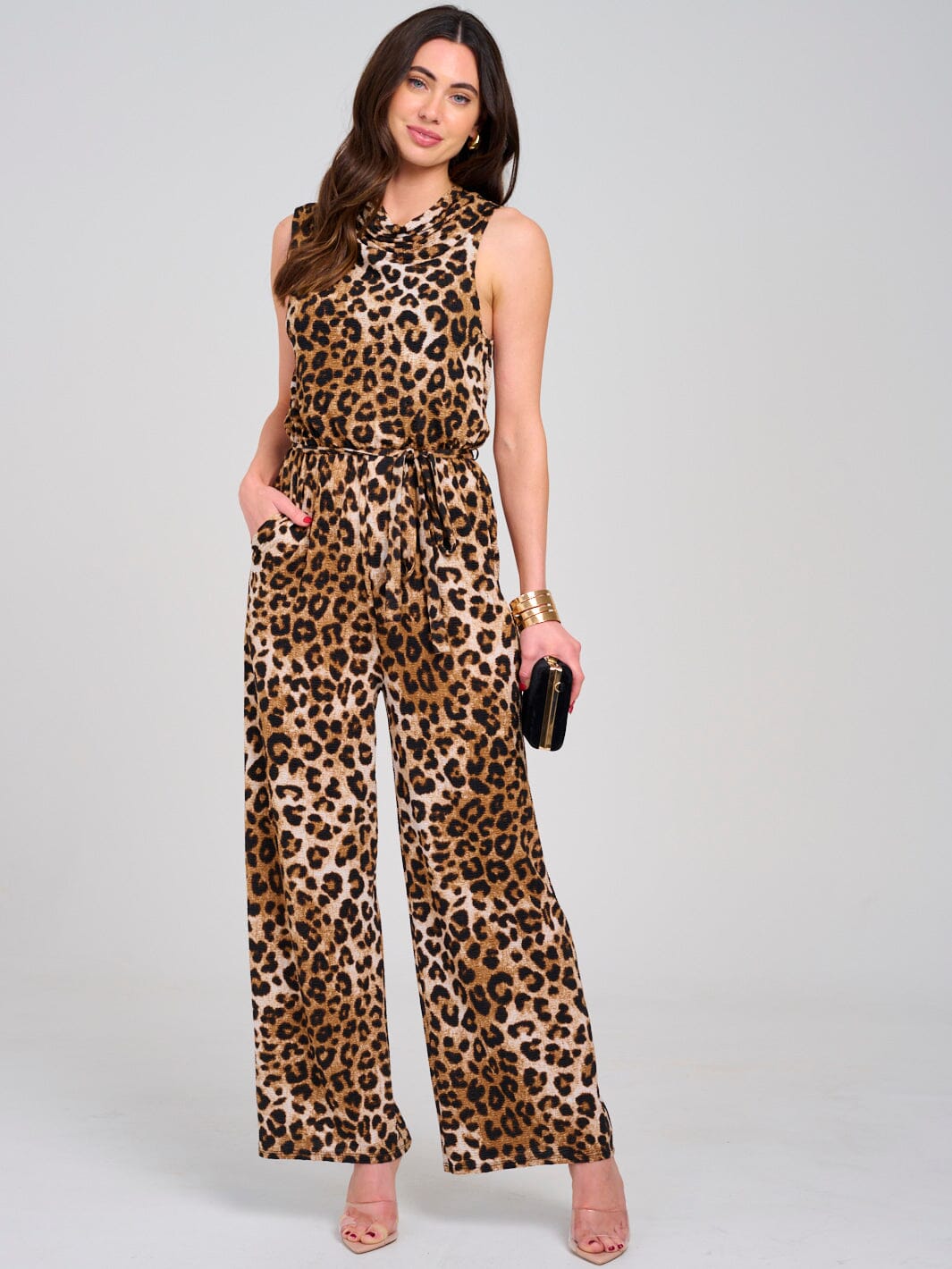 WOMEN'S SLEEVELESS COWL NECK ELASTIC WAIST POCKETS WIDE LEG ANIMAL PRINT JUMPSUIT