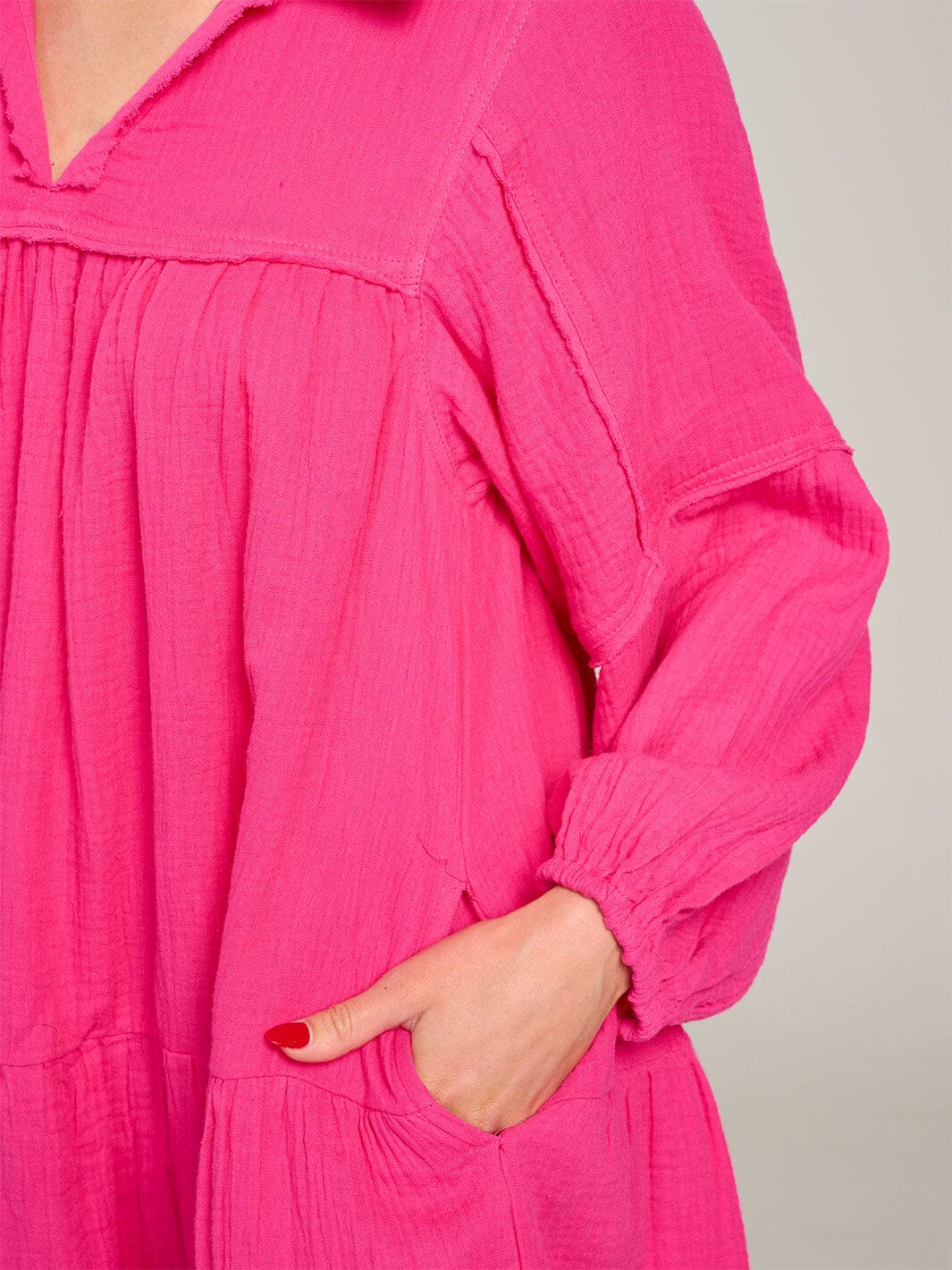 Explore the elegance of our Women's Tiered Midi Dress, featuring long sleeves and a chic V-neckline. Crafted from 100% cotton, this dress boasts a comfortable fit with fashionable front pockets, making it a standout piece for any collection. Perfect for casual outings or layered looks in transitional seasons, this dress is a must-have for retailers looking to add a versatile staple to their offerings.