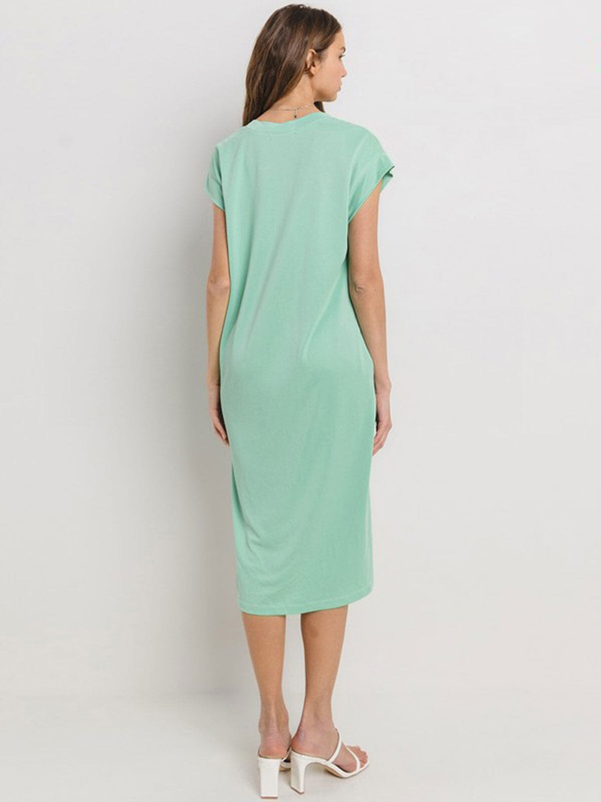 Elevate your boutique's collection with this chic short-sleeve midi dress, featuring a flattering V-neckline and trendy front pockets. Designed with a stylish side slit, this piece crafted from a luxurious modal-polyester blend promises both comfort and elegance. It's an ideal choice for casual daytime outings or as a fashionable choice for brunch events, making it a must-have for retailers looking to capture the latest trends.