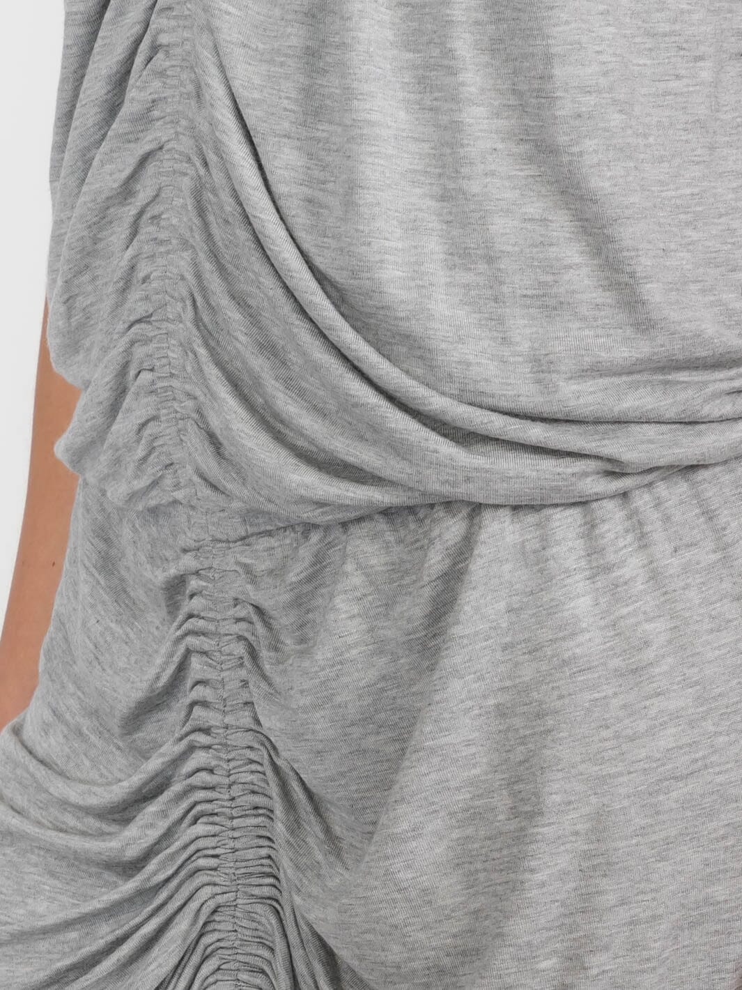 Soft and stretchy fabric, figure-hugging fit, elegant ruched design, sleeveless for layering, ideal for all seasons, easy care, popular with trend-conscious boutiques.