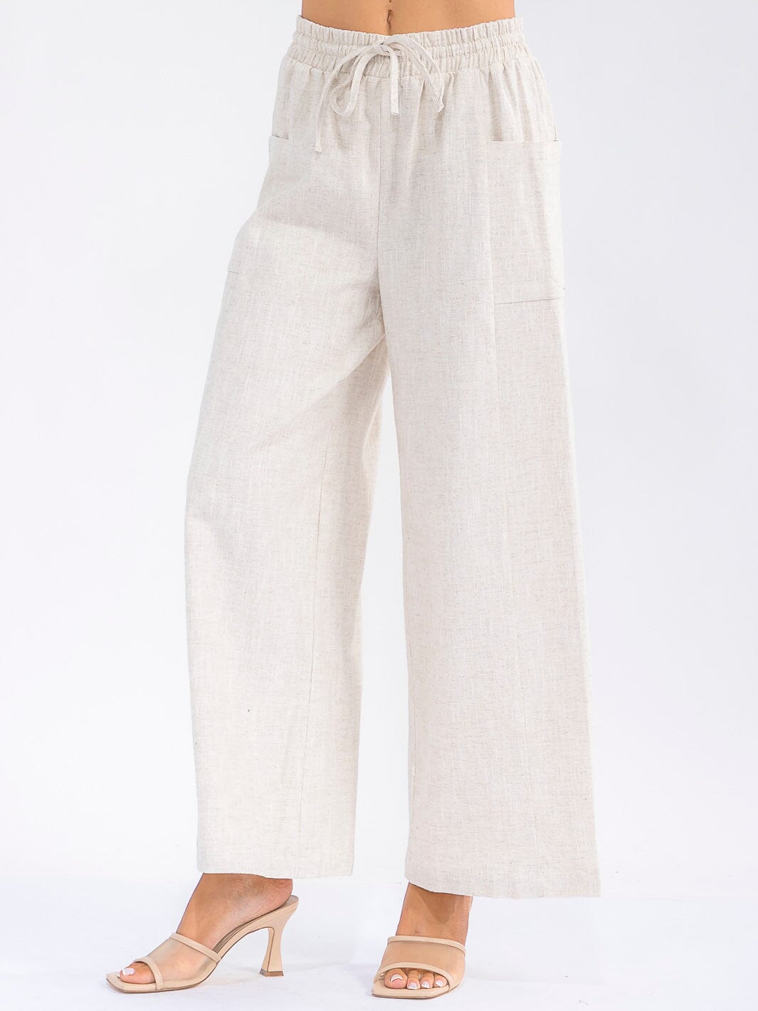 Features:Linen-cotton breathable fabric, wide-leg palazzo silhouette, elastic waist for comfort, functional side pockets, easy machine care, available in Natural and Grey, versatile sizing for inclusive merchandising