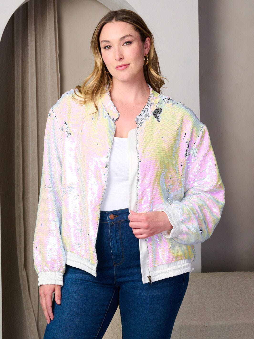 Features:100% Polyester, Sequin Design, Long Sleeves, Zip-Up Closure, Pockets, Flattering Fit