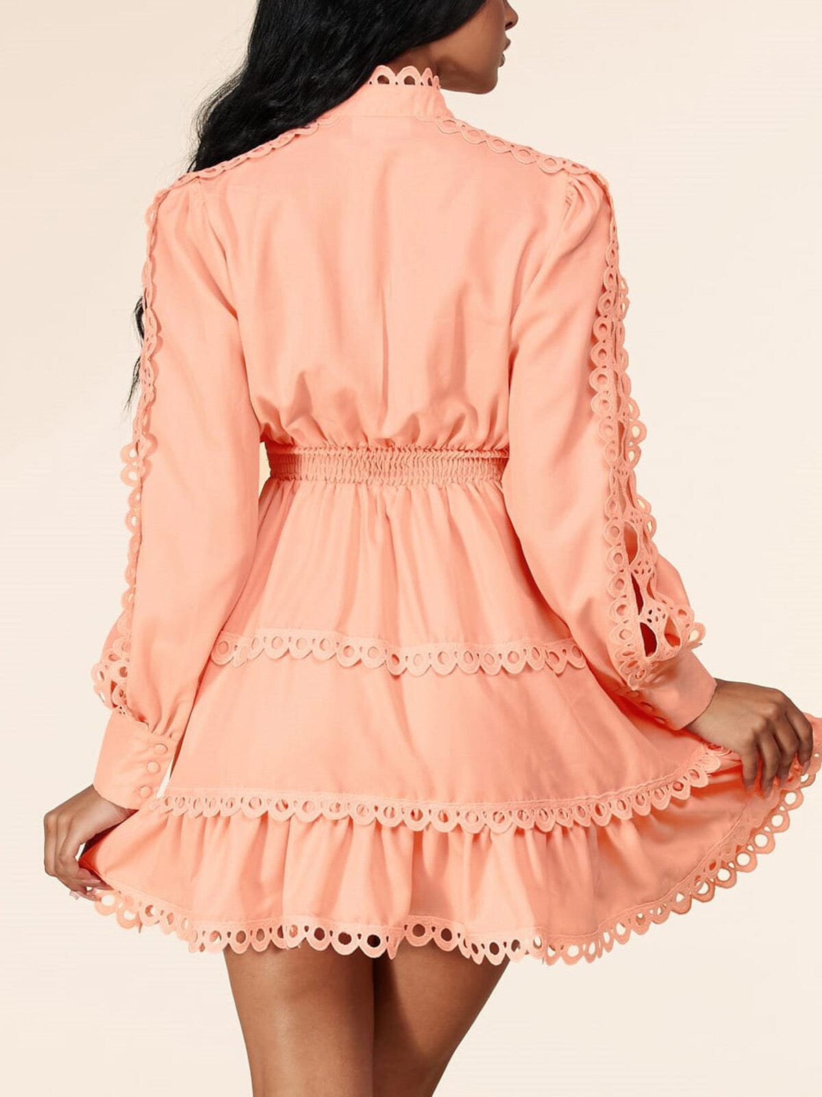 Features:100% Polyester, Smock Waist Design, Eyelet Detailing, Long Sleeves, Mini Length.