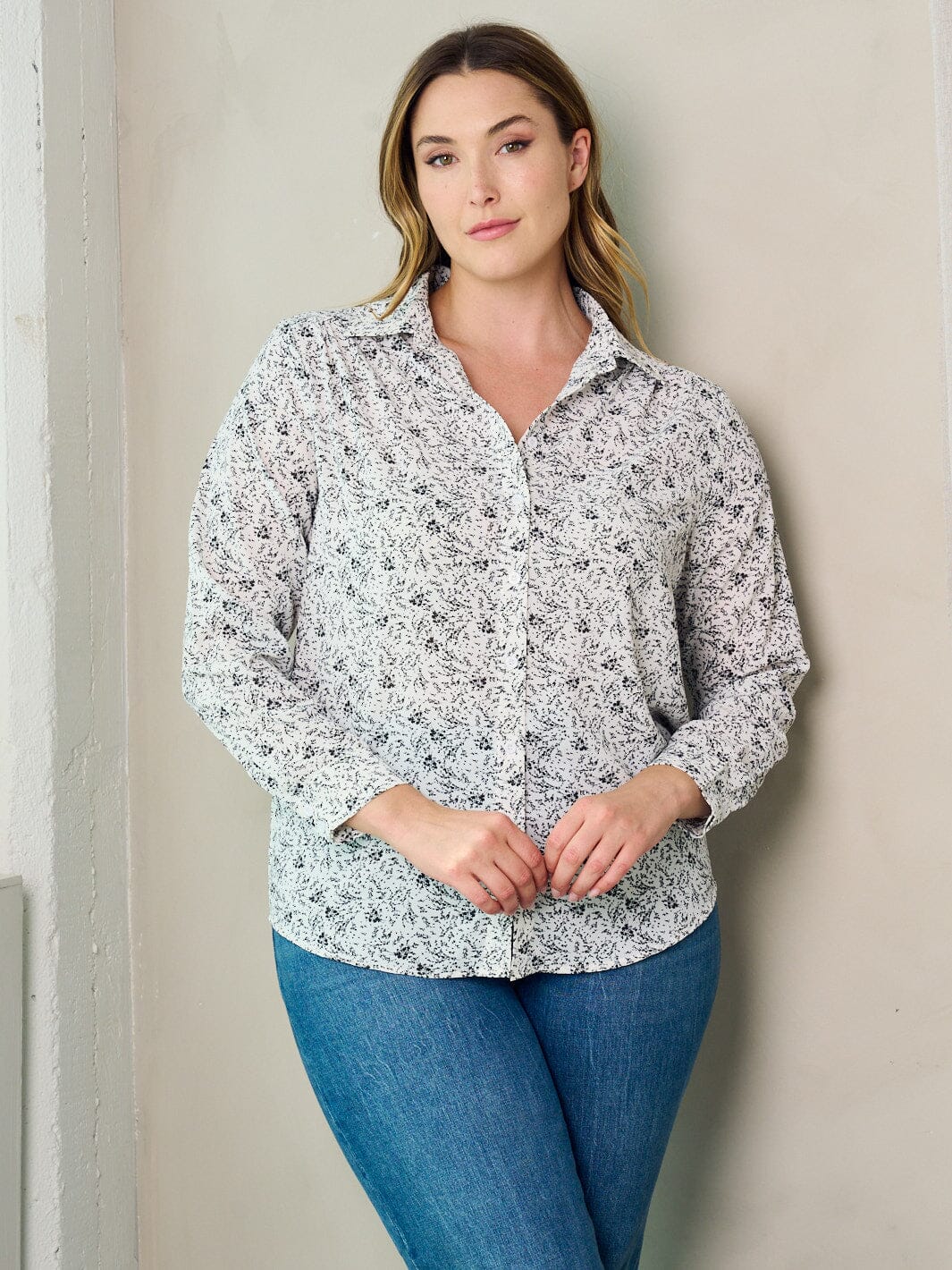 Features:Lightweight 100% polyester fabric, long sleeves, button-up front, versatile and flattering silhouette, on-trend floral design.