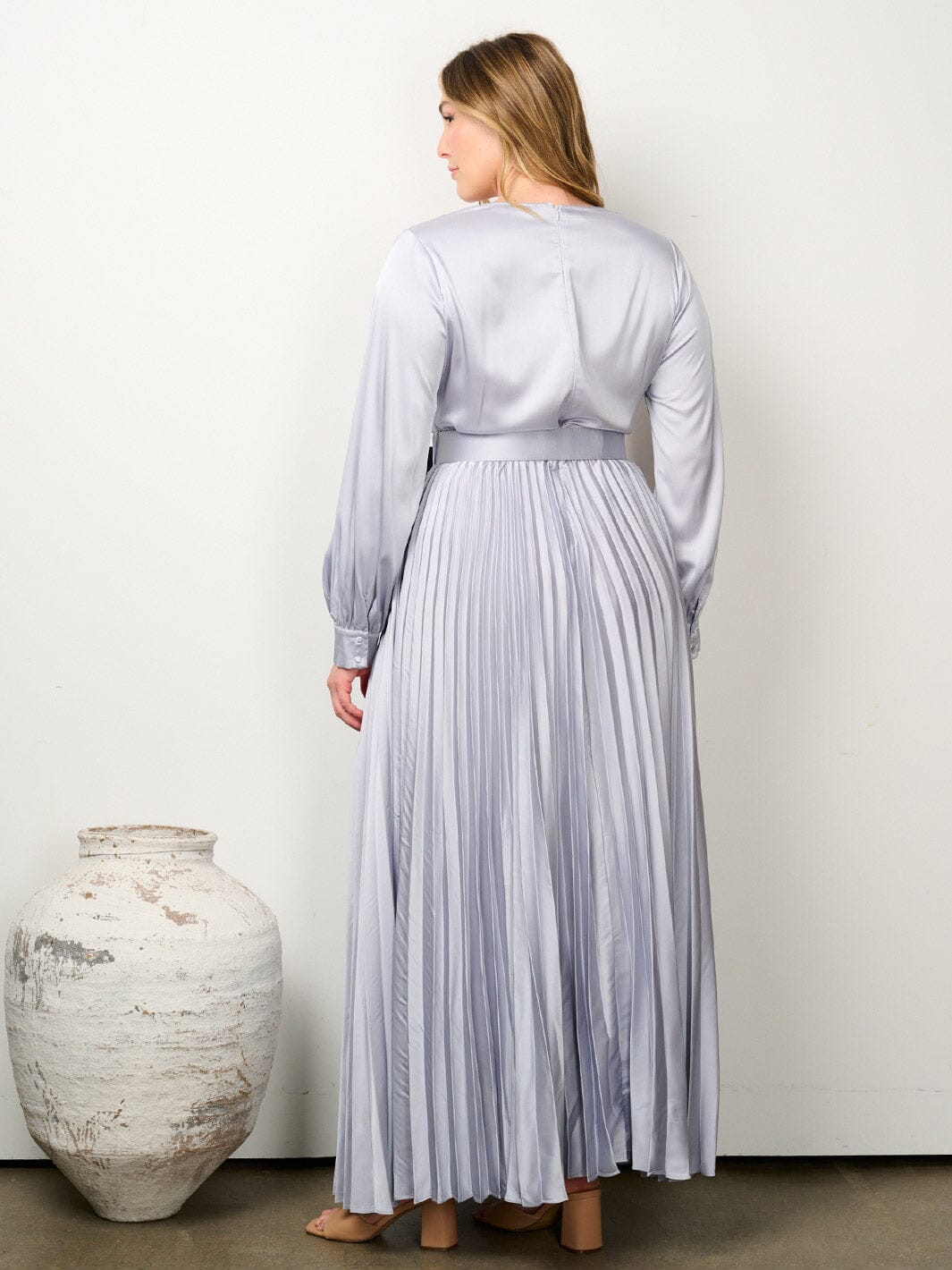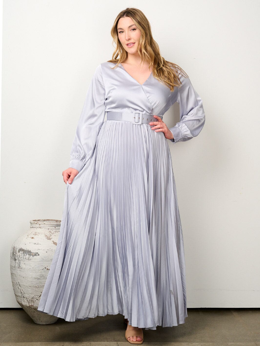 PLUS SIZE LONG SLEEVE SURPLICE BELTED PLEATED MAXI GOWN DRESS