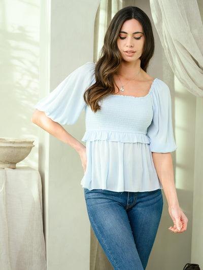Elevate your collection with our women's smocked waist peplum blouse. This top showcases a flattering, fitted silhouette with 3/4 sleeves, crafted from soft, breathable rayon. Its elegant peplum hem and versatile design make it perfect for both casual outings and chic evening attire, making it a must-have for trend-forward boutiques.