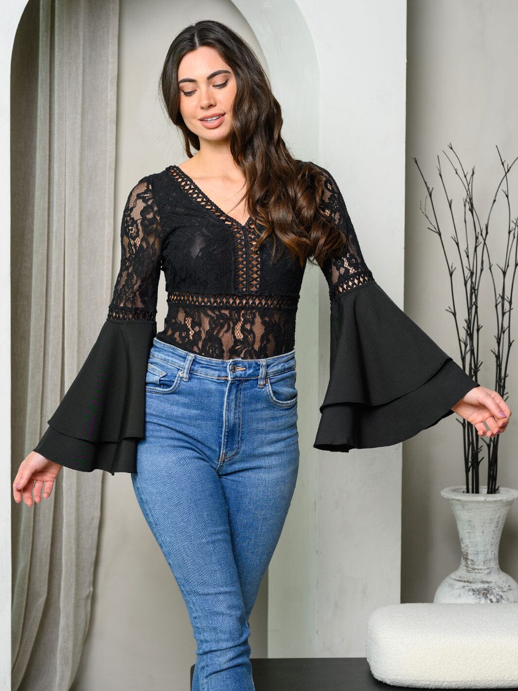 Complete the look:The lace V-neck bodysuit with bell sleeves is a top choice among boutiques for its high markup potential and trend-driven design. With its versatile styling options, it ensures quick turnover and high reorder rates. Displayed both in-store and online, this piece draws attention for its elegant finish and adaptable appeal, making it a smart investment for fashion-forward retailers.