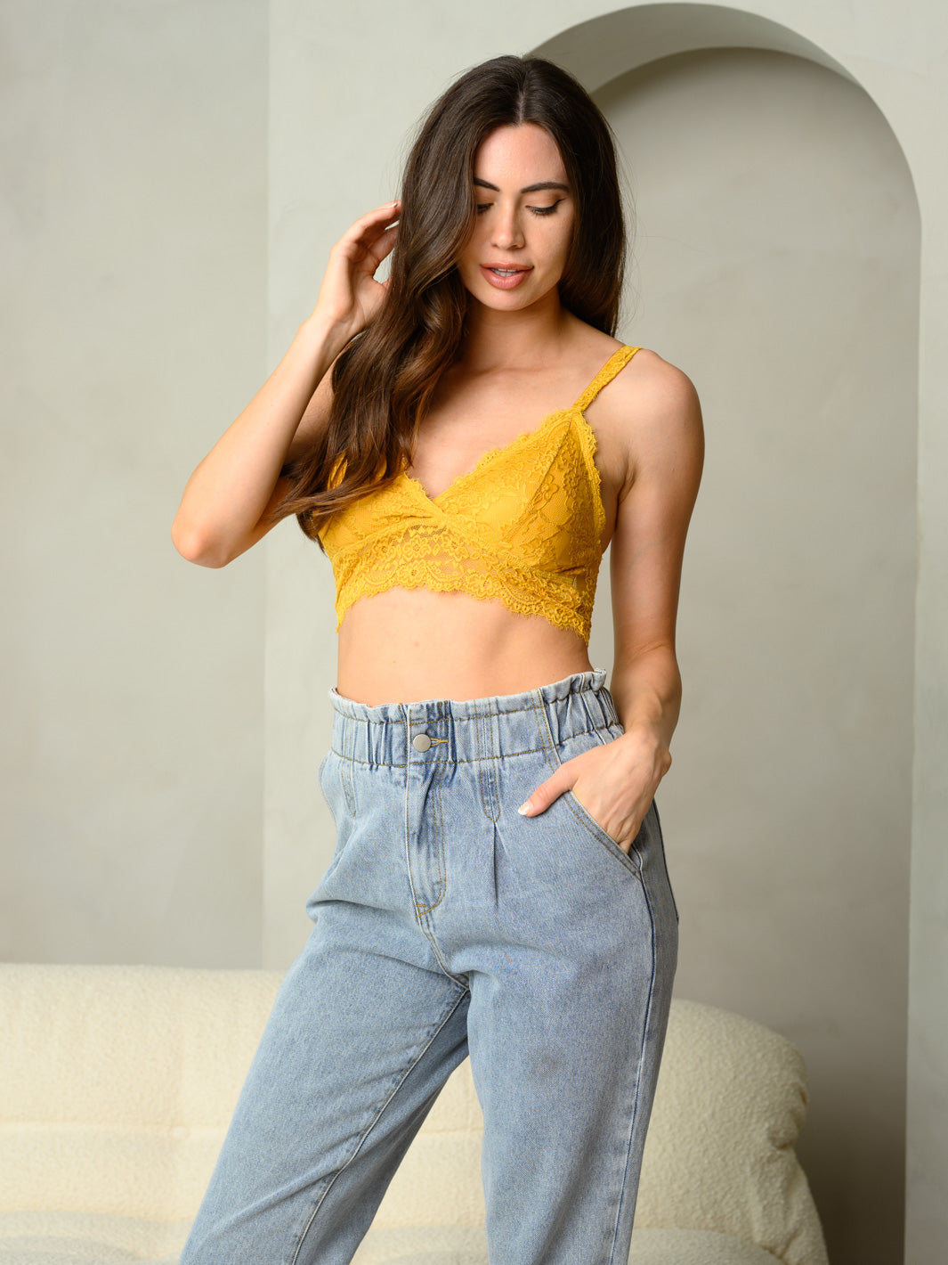 Complete the look:The Women's Sleeveless V-Neck Lace Bralette is a must-have for retailers for several reasons. Its versatile design allows it to be easily styled for any season or occasion, making it a reliable and profitable piece for boutiques. With its trend-forward silhouette and delicate lace details, this bralette is sure to catch the eye of customers and increase sales. Plus, with a high markup potential and reorder reliability, this bralette is a valuable asset to any boutique's inventory.