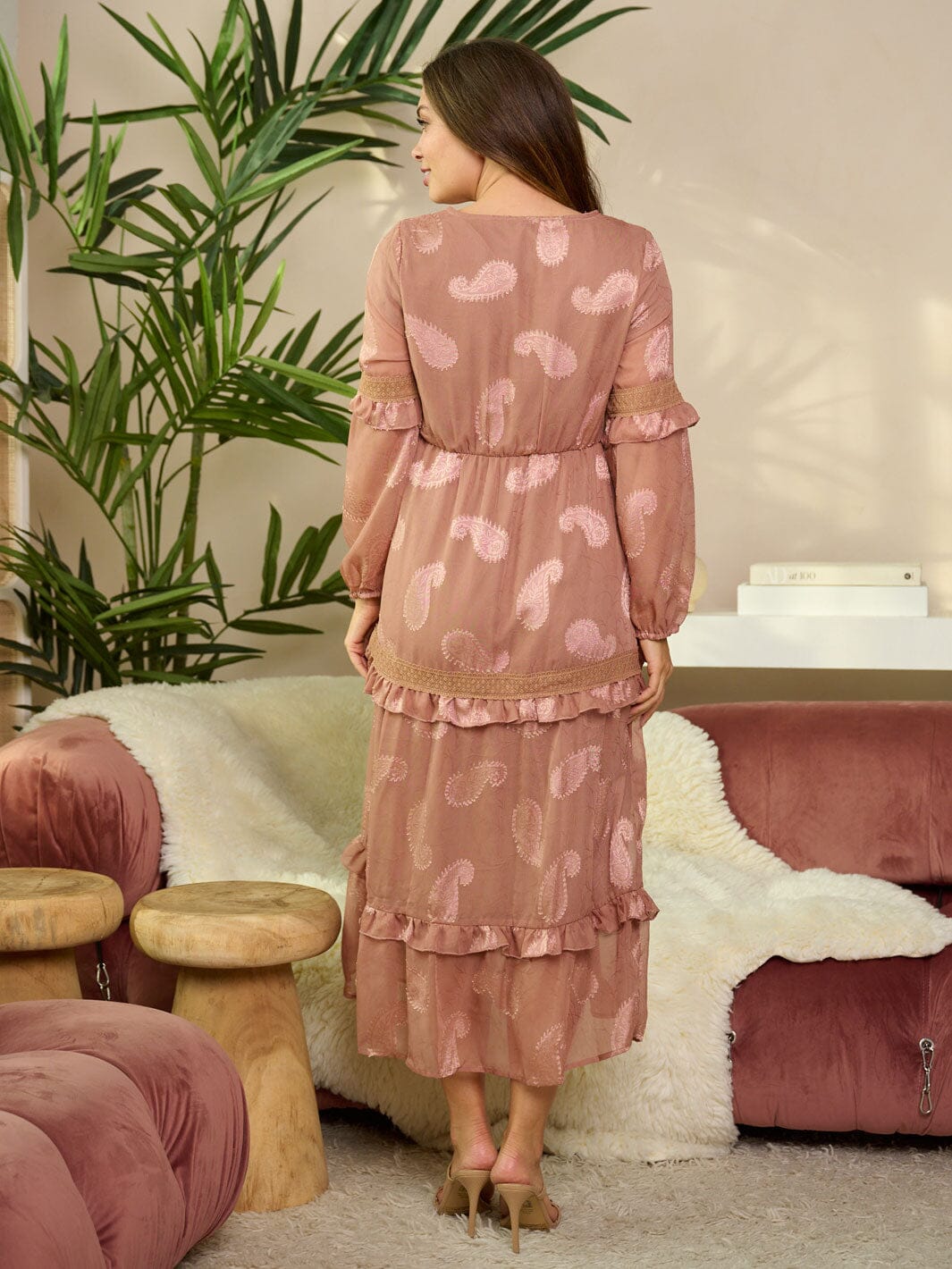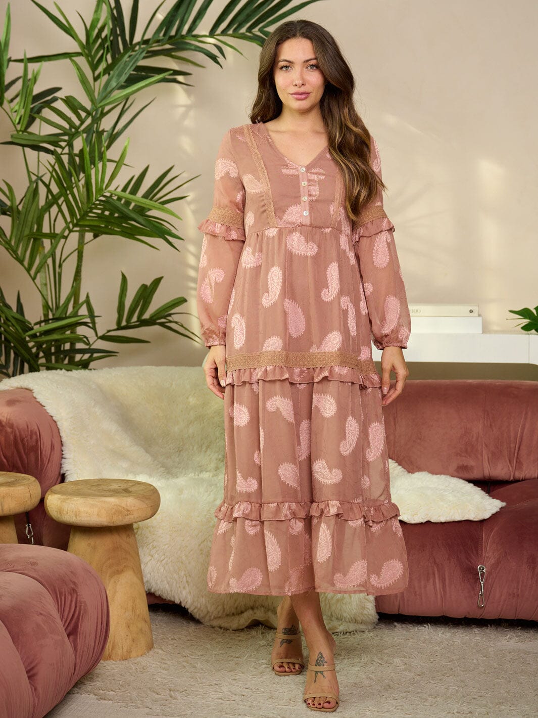WOMEN'S LONG SLEEVE V-NECK TIERED RUFFLE PAISLEY PRINT MAXI DRESS