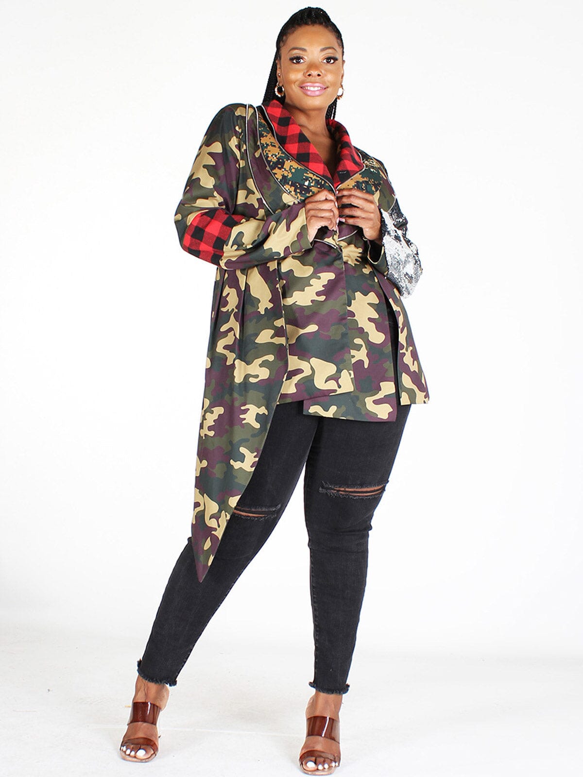 PLUS SIZE LONG SLEEVE BUTTON CLOSURE CAMO MULTI JACKET
