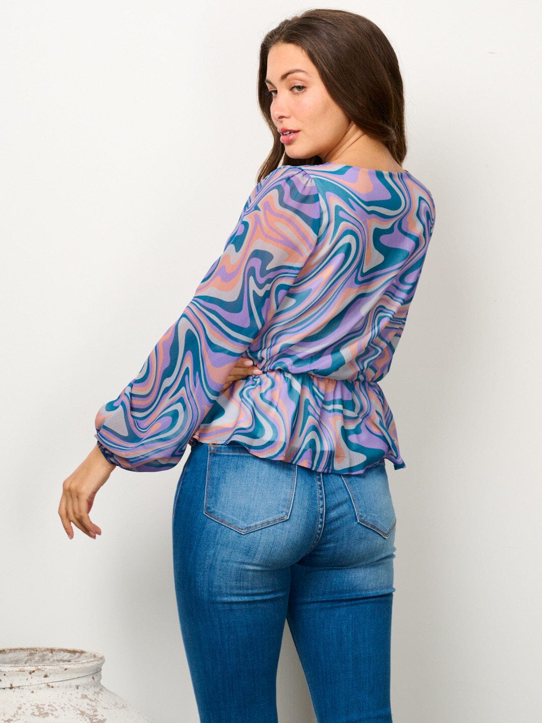 WOMEN'S LONG SLEEVE SURPLICE PRINTED PEPLUM BLOUSE TOP