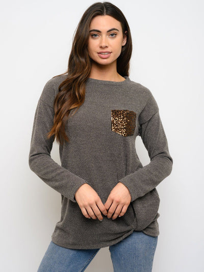 Discover the effortless elegance of our Women's Sequin Pocket Long Sleeve Top featuring a flattering front knot design. Crafted with a blend of polyester, rayon, and spandex, this top offers both comfort and a touch of glamour, making it a bestseller with boutiques. Perfect for casual outings or as a trend-forward layering piece, it pairs seamlessly with a variety of bottoms for versatile styling.