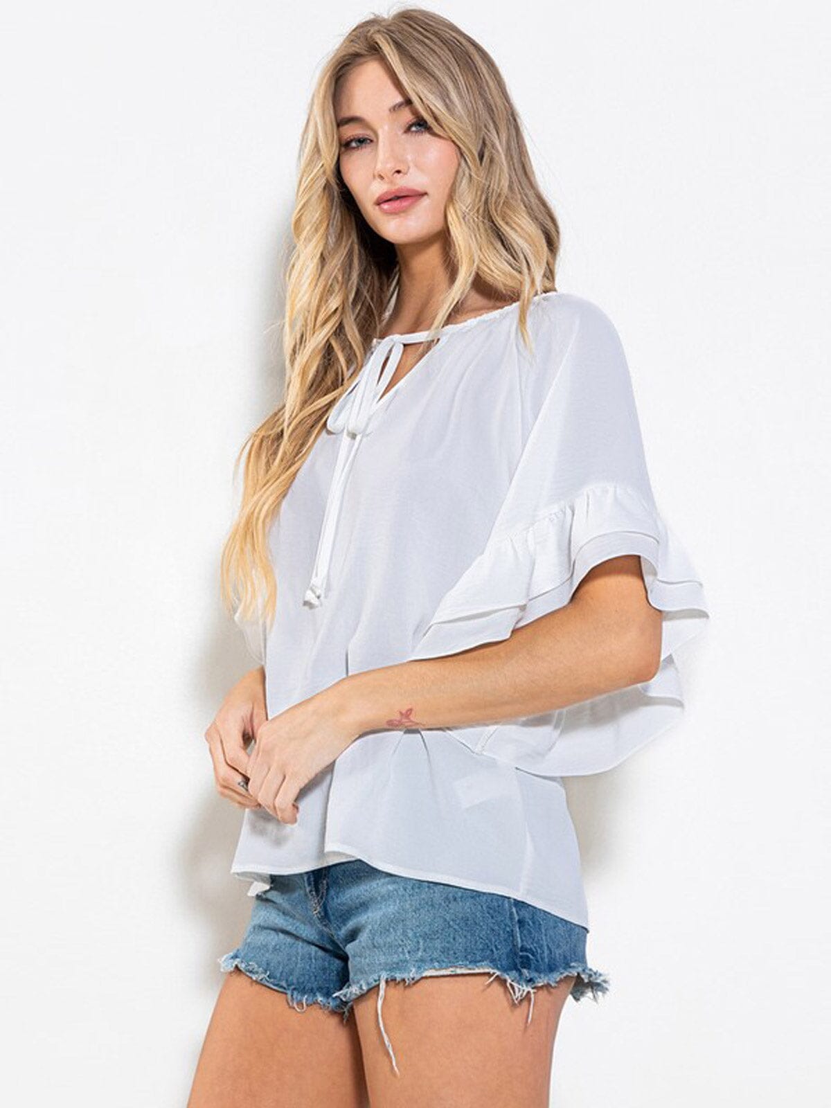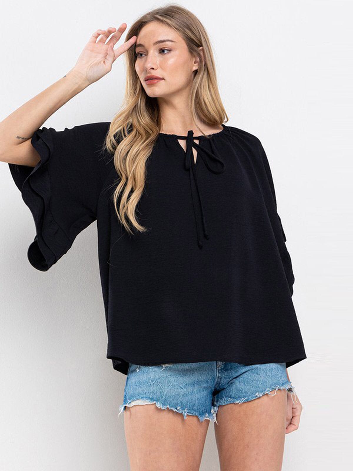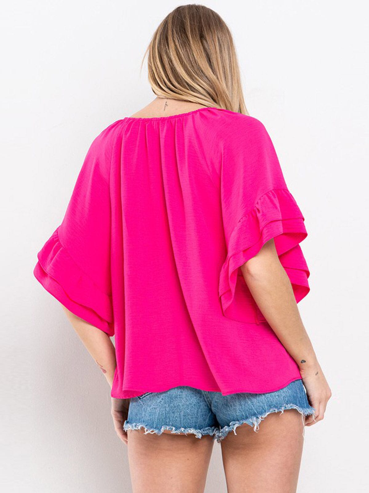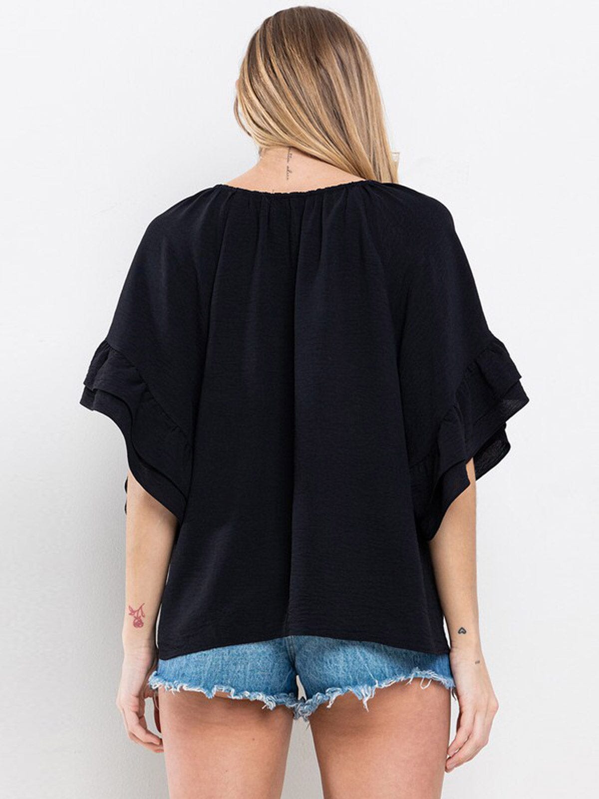 100% Polyester, Short Ruffle Sleeves, Tunic Silhouette, Versatile Styling, Comfortable, Ideal for layering.