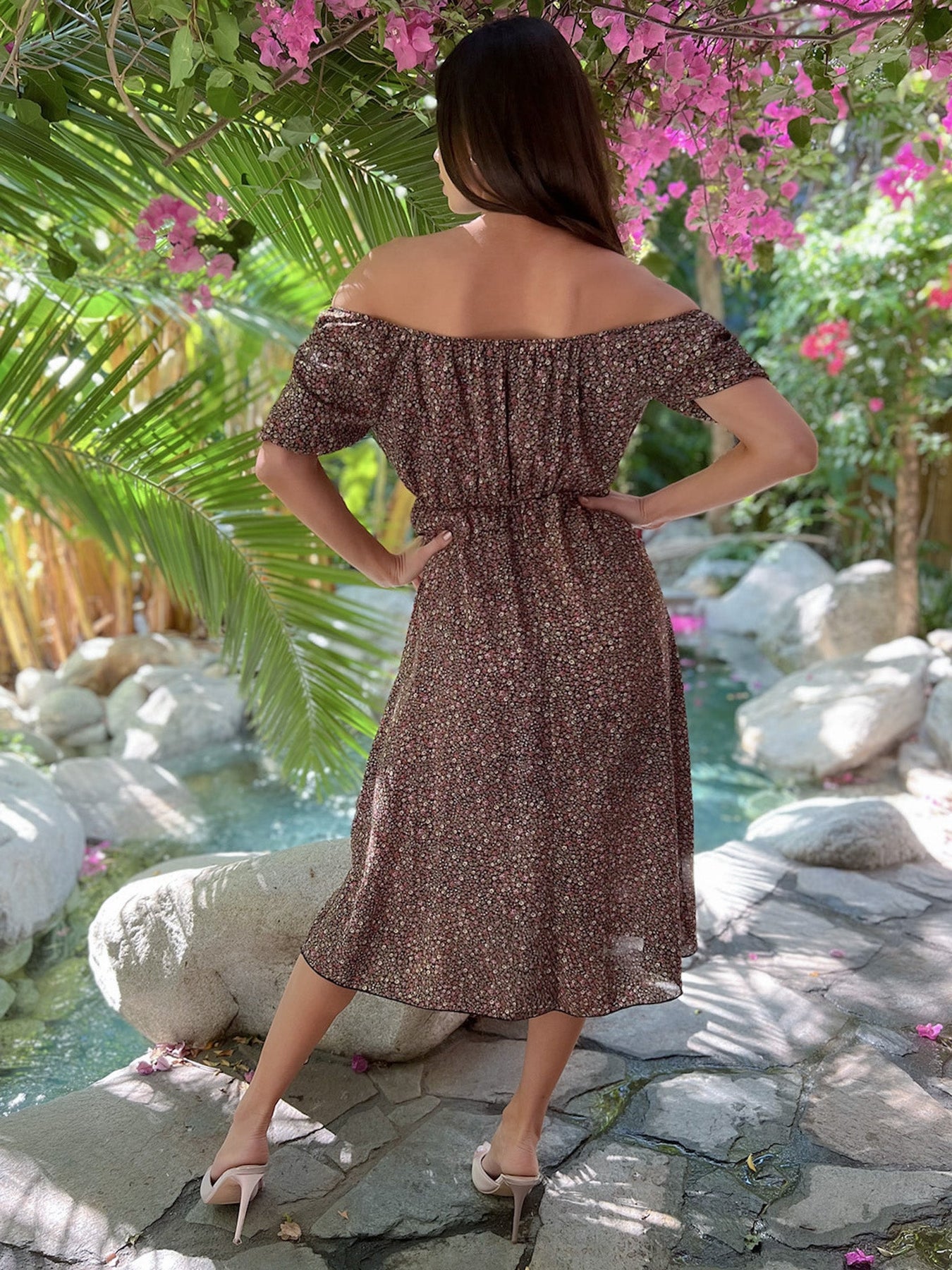 Introducing our must-have trend-forward floral midi dress, perfect for retailers and boutique owners. Made from 100% polyester, this dress features a flattering silhouette and eye-catching floral design. Ideal for any season, this dress can be dressed up or down for various occasions.