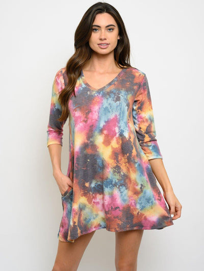 WOMEN'S 3/4 SLEEVE TIE DYE TUNIC MINI DRESS