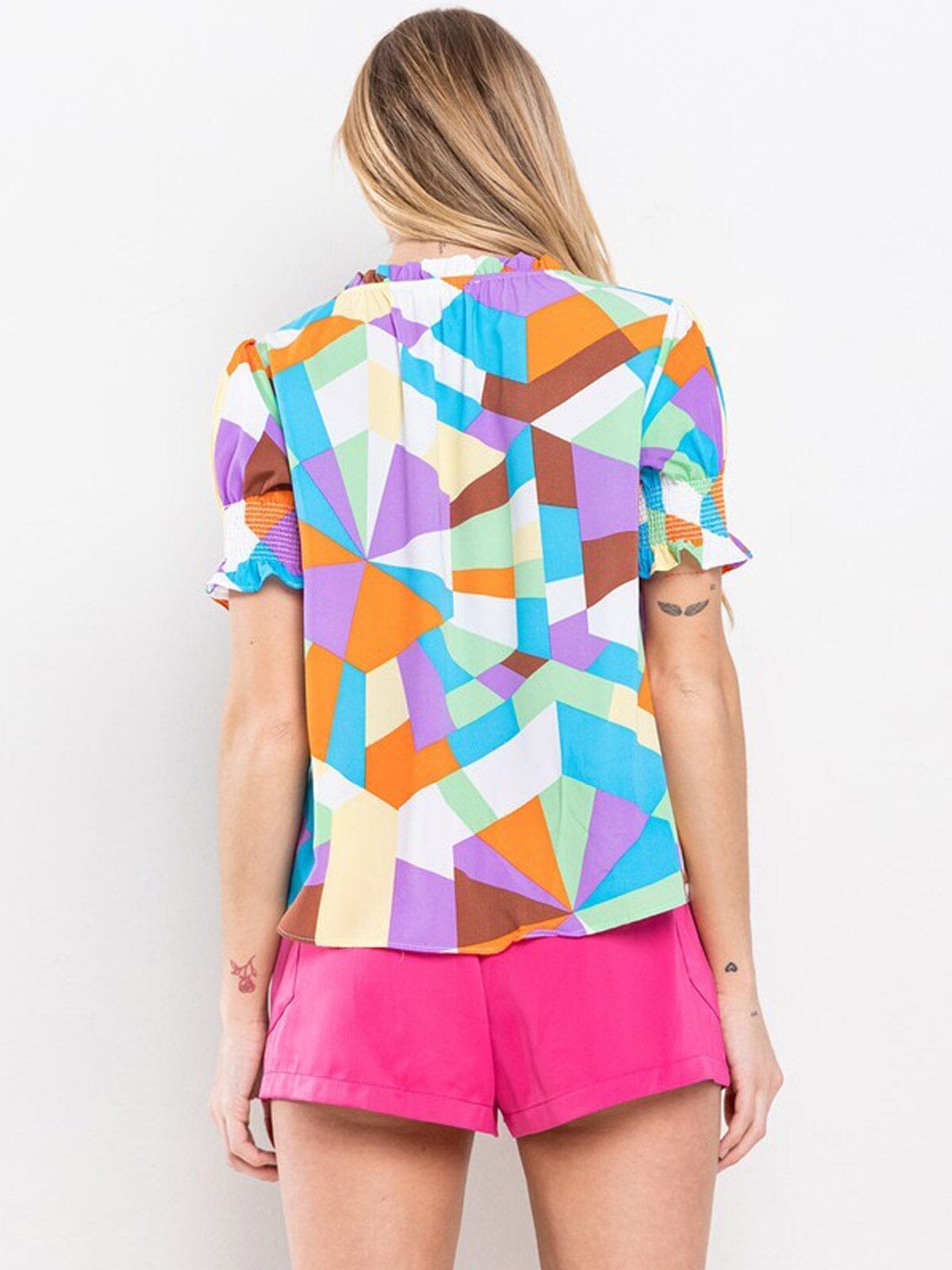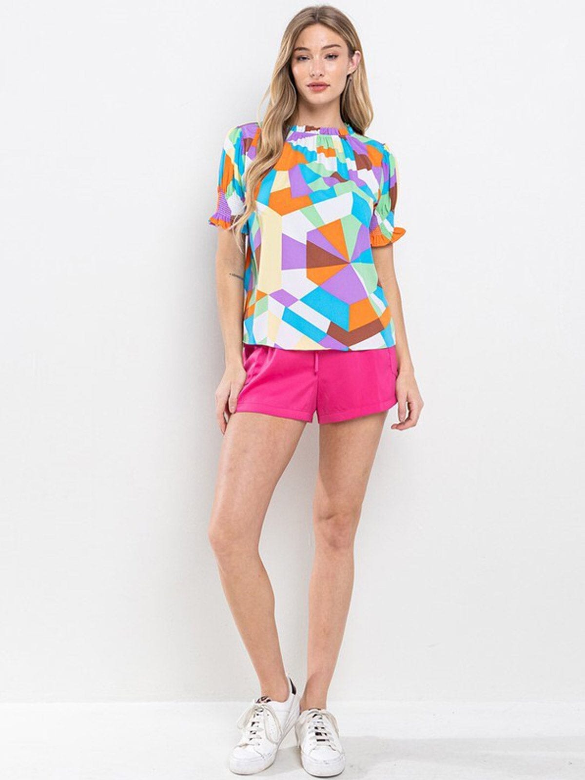 This multi-hued short-sleeve top is a favorite among boutique owners, offering excellent potential for high markups and ease of reordering. Its bright, eye-catching design aligns perfectly with current trends, making it an attractive piece for both in-store displays and online promotions. Retailers love its versatility and universal appeal, ensuring it remains a staple in seasonal inventories.