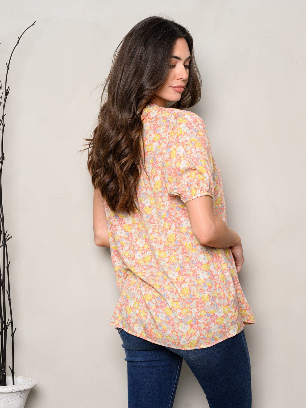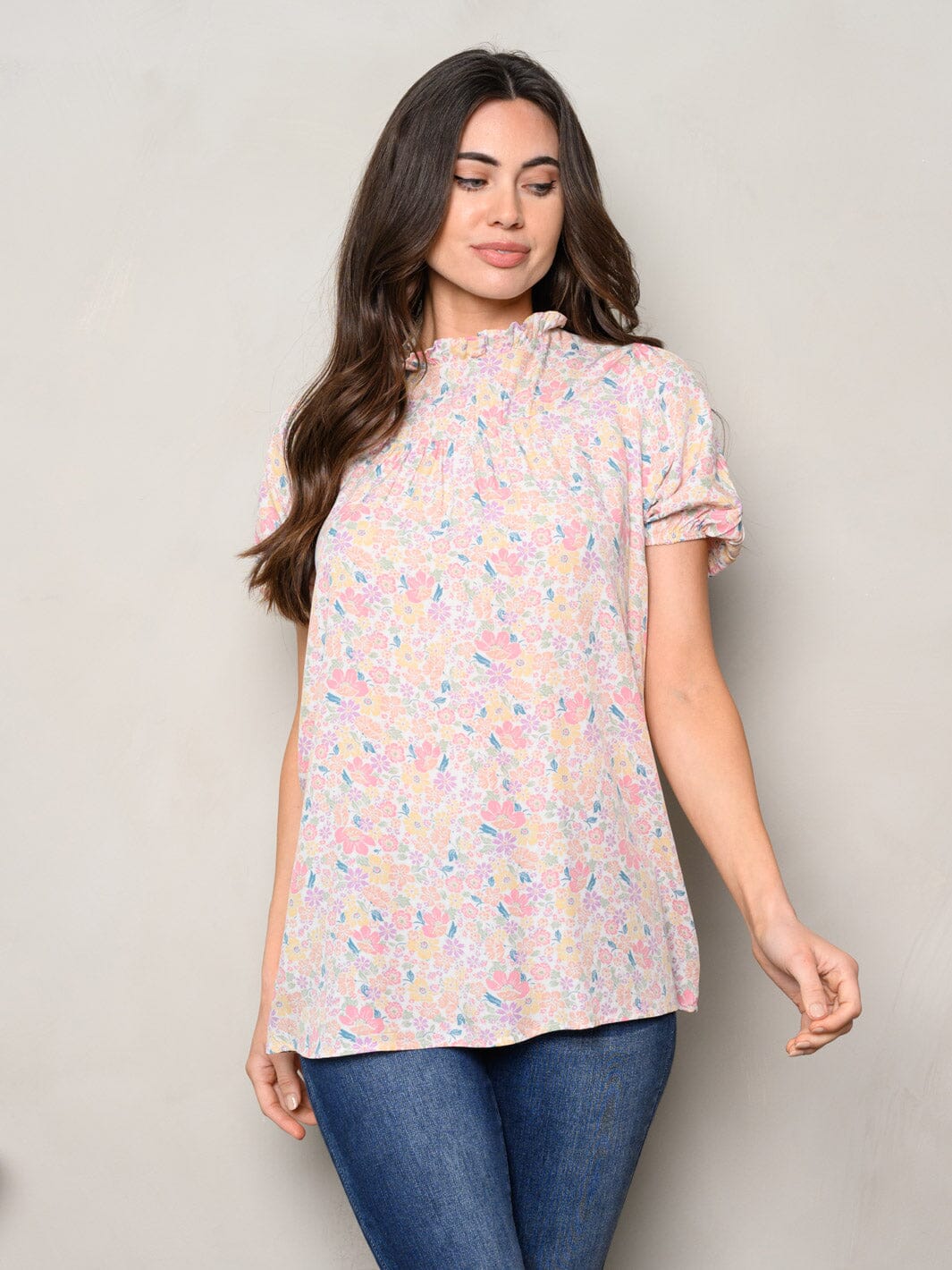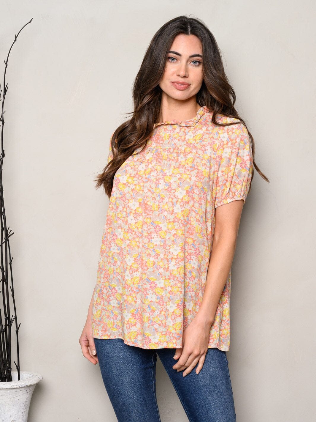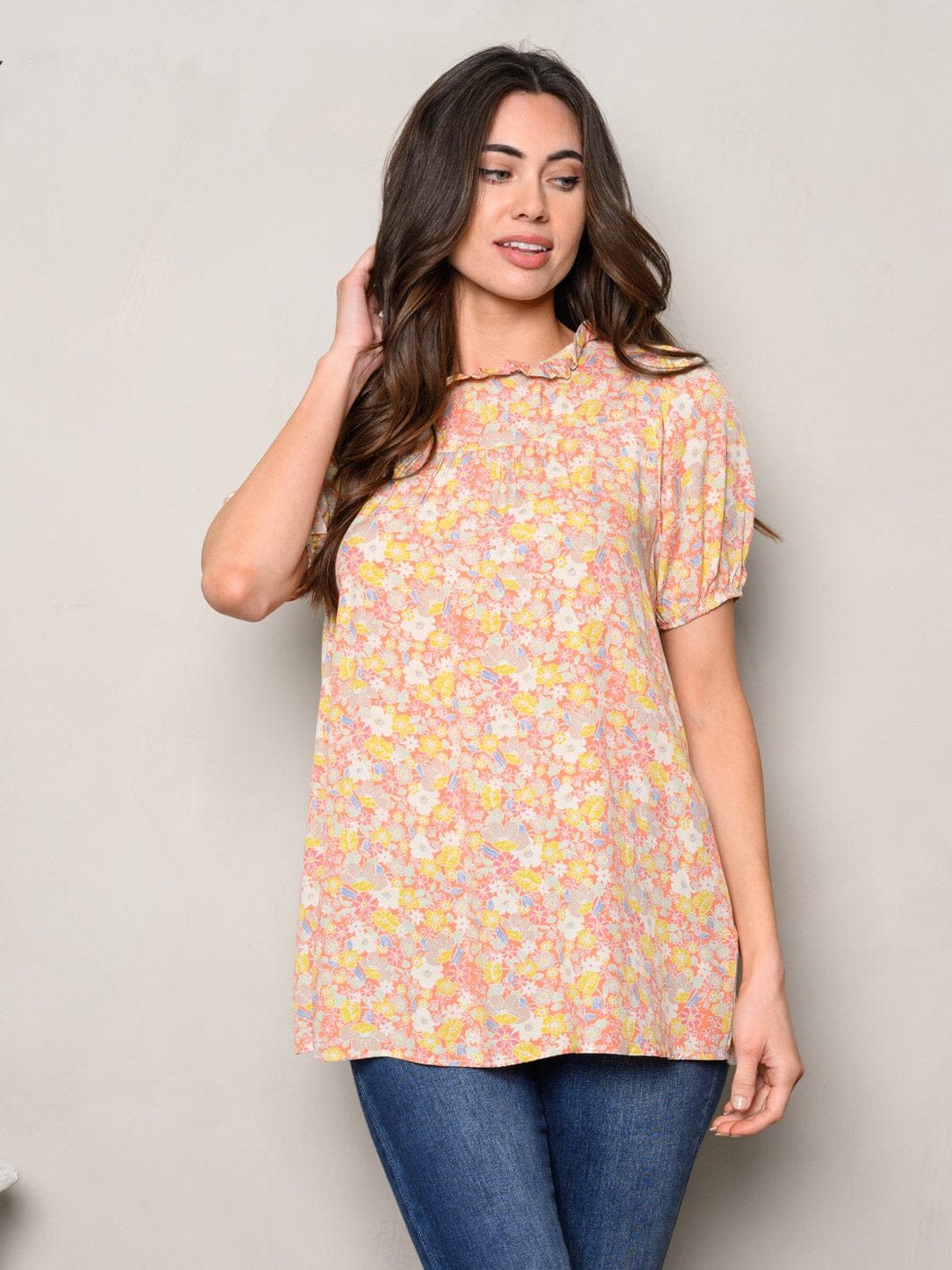 Features:soft rayon fabric, flowy silhouette, ruffle detail, vibrant floral print, versatile layering piece, ideal for spring and summer, boutique-friendly pricing