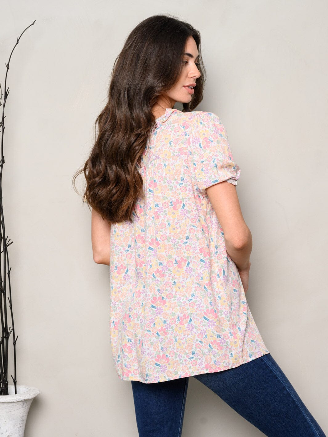 Discover our charming women's short-sleeve floral tunic, a perfect fusion of comfort and style that makes it a bestseller with boutiques. This tunic features a delicate ruffle detail and a flowy silhouette, crafted from soft, breathable rayon. Ideal for layering or wearing solo, it's the ultimate piece for day-to-night transitions or casual weekend outings.