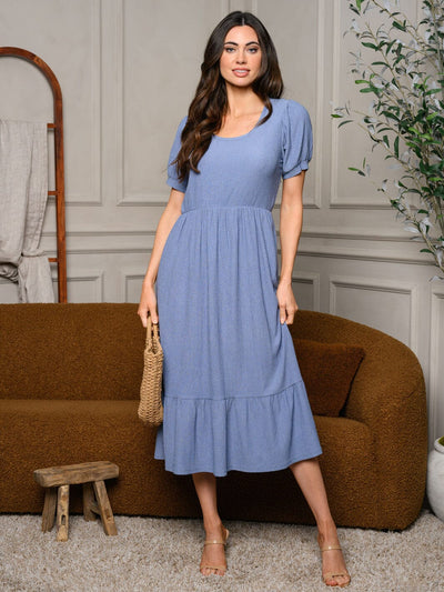 Elevate your boutique's collection with this stunning midi dress featuring short puff sleeves and a ruffle bottom hem. Crafted from a soft polyester-spandex blend, this dress contours to the body while offering a graceful silhouette. Ideal for spring events and summer outings, this piece is a favorite for trend-forward retailers looking to offer a versatile and stylish wardrobe staple.