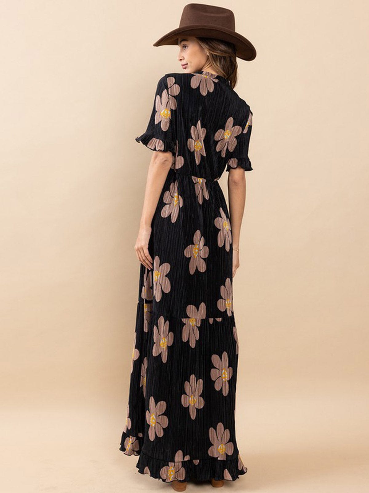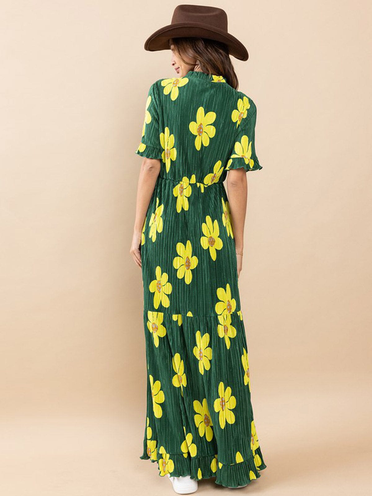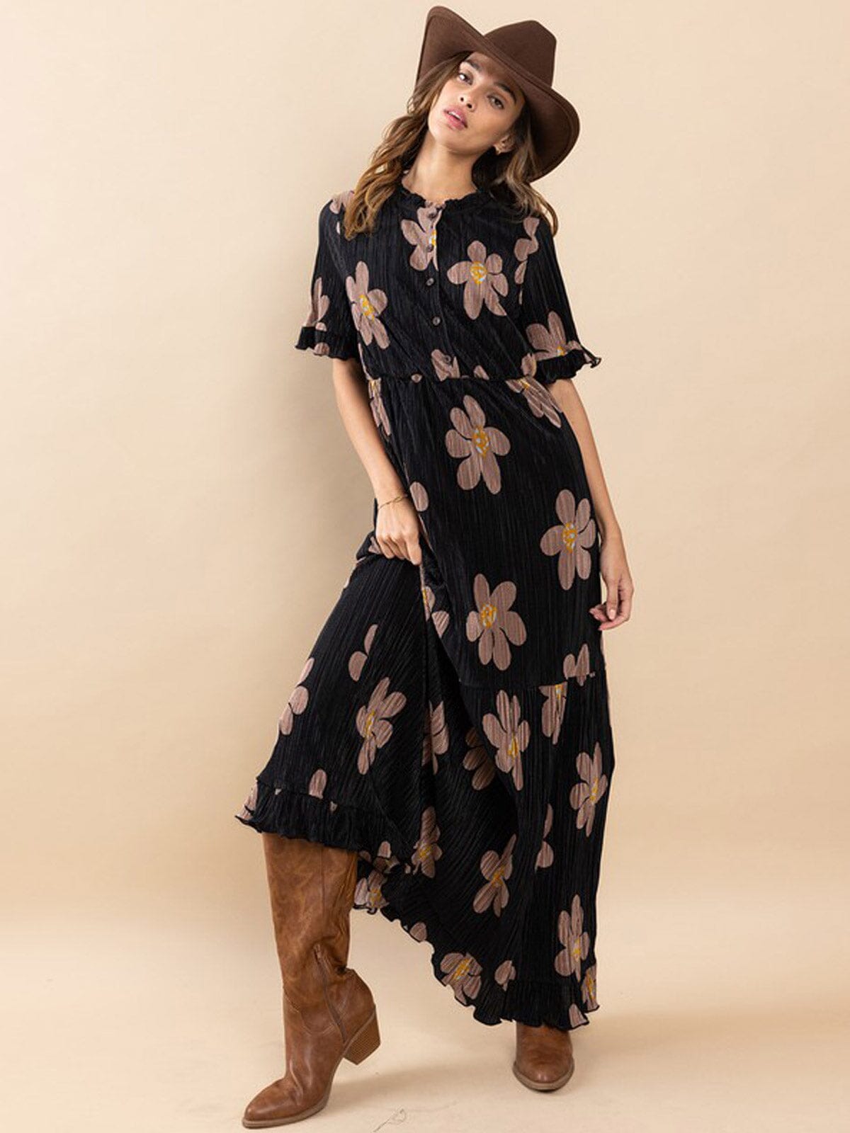 The Women's Floral Maxi Dress is a must-have for retailers looking for a trend-forward, versatile piece to add to their inventory. This dress features short sleeves, a ruffle elastic waist, and a beautiful floral design that is perfect for any season. Made with 100% polyester, this dress is both comfortable and stylish, making it a bestseller with boutiques.