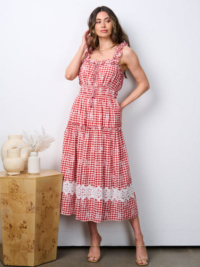 Discover elegance with the women's sleeveless ruffle tiered dress, crafted from lightweight fabric that flows beautifully with every step. This maxi dress features intricate eyelet details and a tiered silhouette, offering a timeless yet contemporary appeal. Perfect for boutique owners seeking a standout piece for summer events or resort collections, it pairs fashion-forward design with wearable comfort.