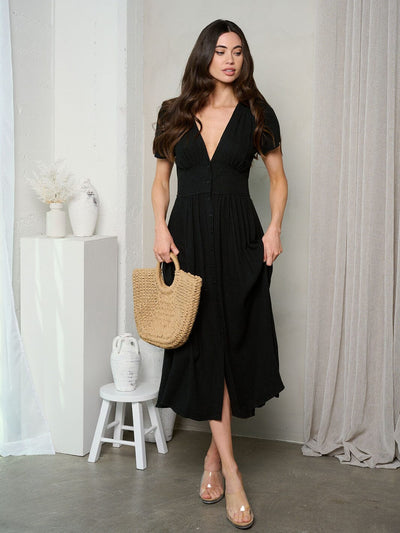Introducing the button-up short sleeve midi dress with a flattering V-neck design, perfect for those seeking a stylish yet comfortable piece. Crafted from a luxurious linen-rayon blend, this dress offers a chic silhouette that’s ideal for any occasion, from casual outings to semi-formal events. A favorite among boutique owners, it's a versatile addition to any collection, effortlessly accommodating trend-forward layering for a variety of styling scenarios.