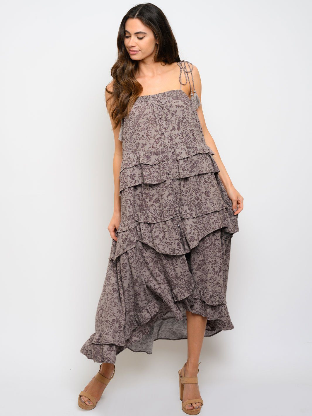 Add a touch of elegance to your boutique collection with our Women's Ruffle Layered Buttons Detail Maxi Dress. This stunning dress features a flowy silhouette, made with 100% rayon for a luxurious drape. Designed with ruffle detailing and charming button accents, this dress is perfect for a variety of styling options. A must-have for any retailer, this dress is a trend-forward, seasonless piece that will surely become a bestseller with boutiques.