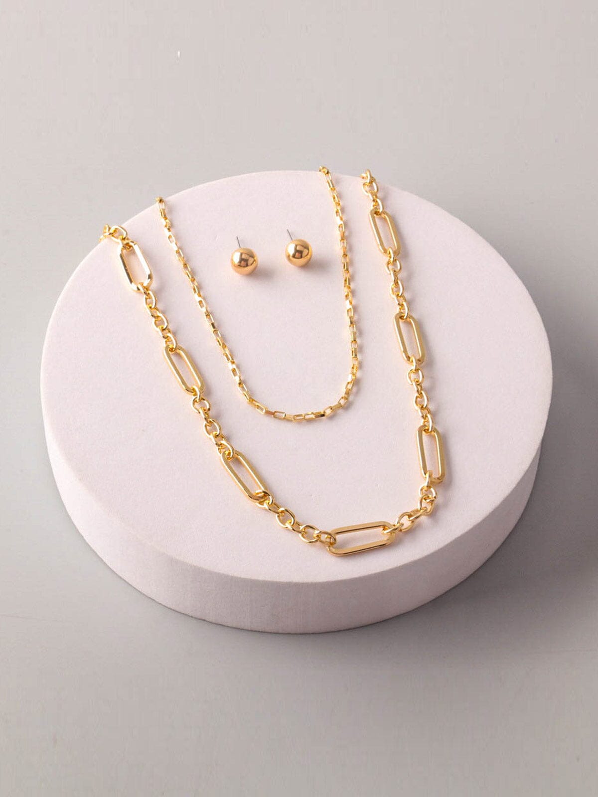 The FASHION CHAIN EARRINGS & NECKLACE 3PCS SET is a trendy and versatile addition to any boutique's collection. This set includes a pair of chain earrings and a matching necklace, adding a touch of glamour and edge to any outfit. The chain design and high-quality materials make this set a must-have for retailers, and is sure to be a bestseller with boutique owners looking for trend-forward layering pieces.