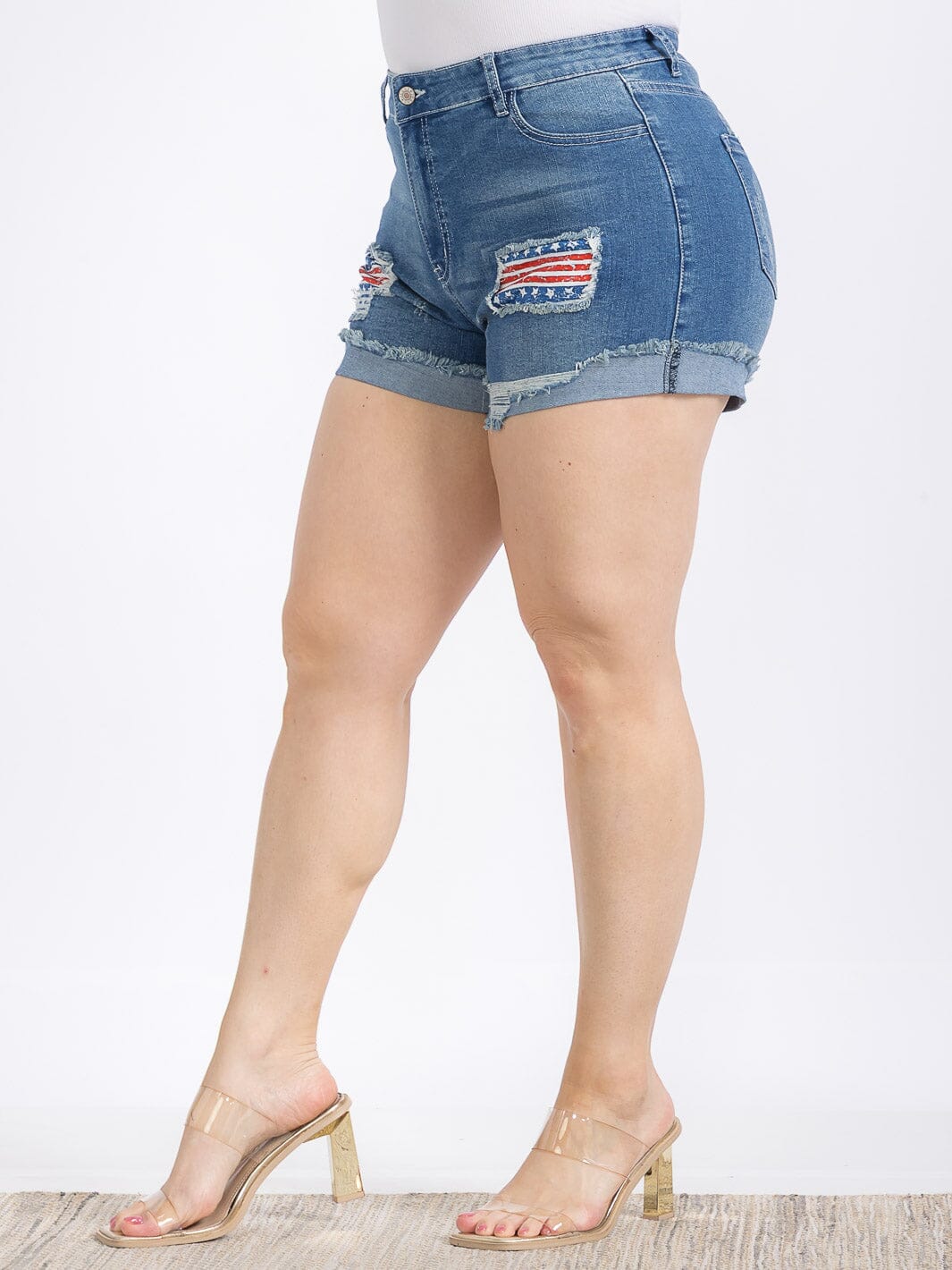 PLUS SIZE BUTTON CLOSURE POCKETS DISTRESS PATRIOTIC DENIM MINI SHORTS