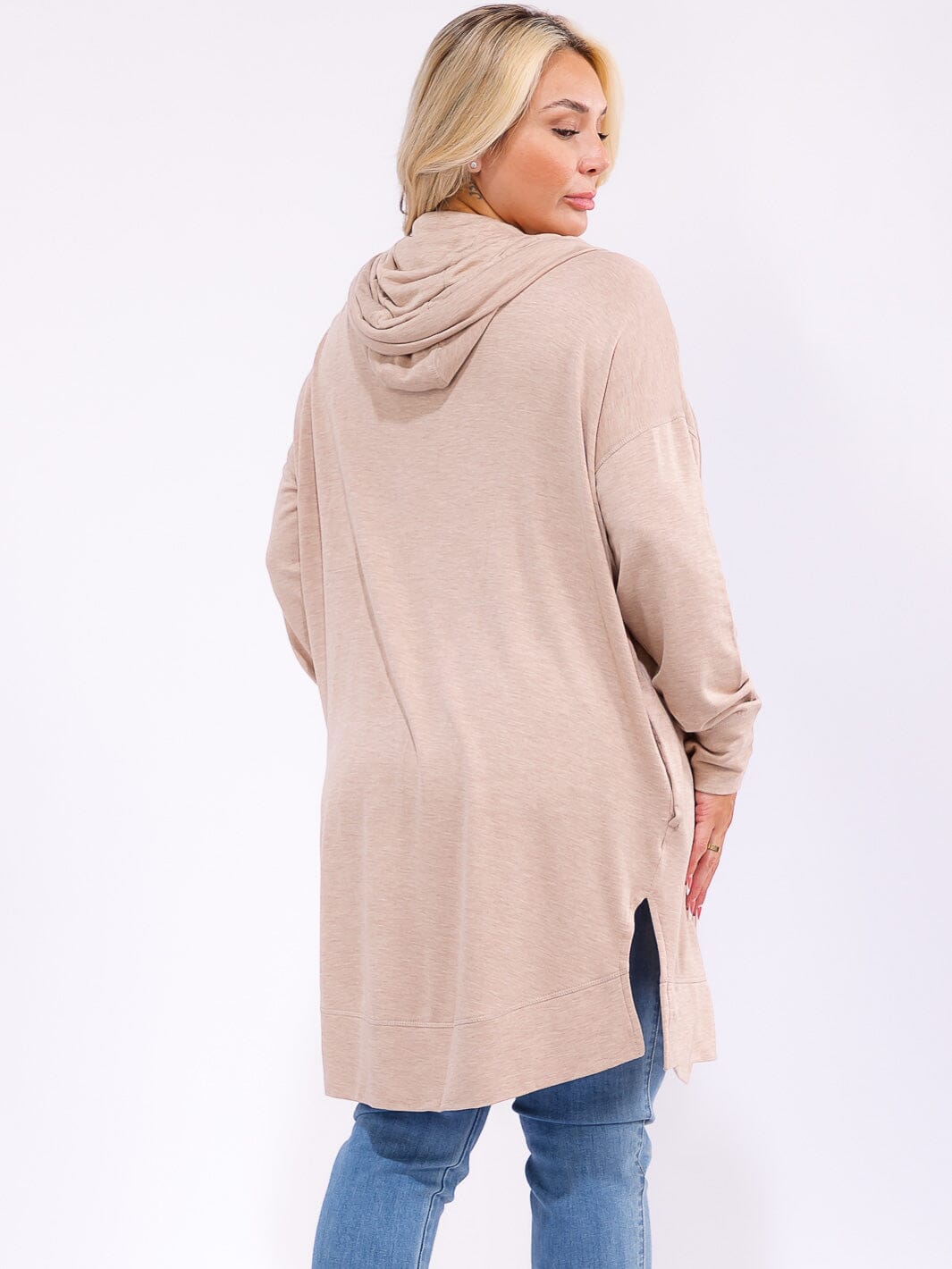Features:soft rayon-spandex fabric blend, open front design with roomy patch pockets, relaxed hooded silhouette, easy layering for plus size figures, machine washable for retail convenience, versatile for casual or dressed-up outfits, seasonless appeal for year-round sales