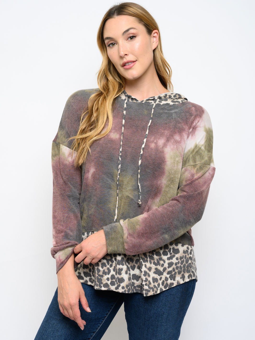 Plus Size Long Sleeve Tie Dye Animal Print Hoodie Top is a versatile and trendy piece that will attract customers of all sizes. It has a high markup potential and is a reliable seller for boutiques. This top's eye-catching design and comfortable fit make it a popular choice among customers. It's a great addition to any boutique's inventory and is perfect for in-store or online displays. Order now and give your customers the must-have item of the season!