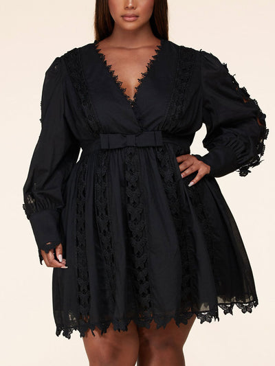 PLUS SIZE LONG SLEEVE V-NECK BUTTERFLY CROCHET DETAILED MINI DRESS