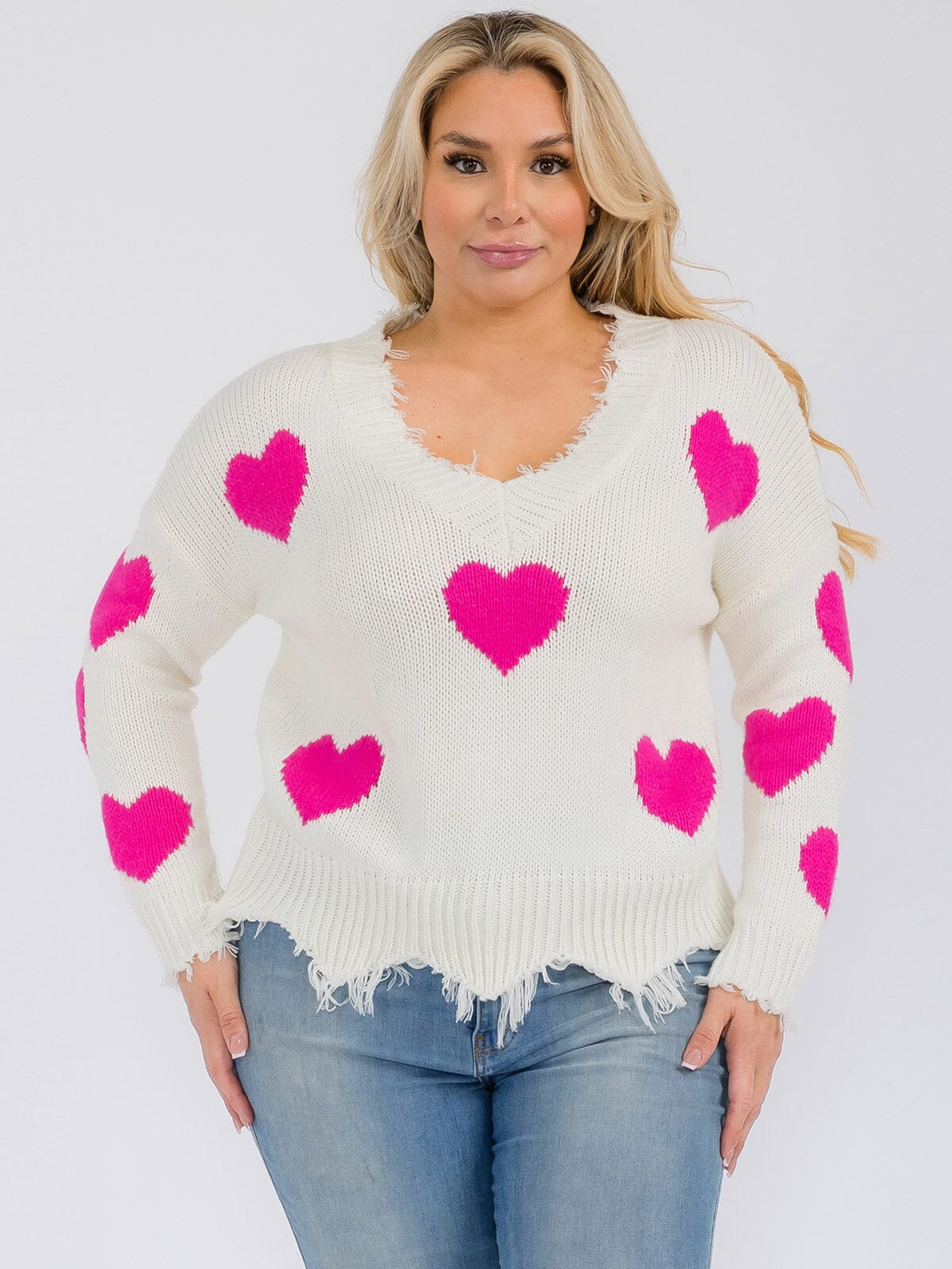 Complete the look:The Plus Size V-Neck Heart Sweater stands out with its charming design and versatile appeal. Loved by boutique owners for its attractive price point and easy styling options, this sweater is a reliable choice for any collection. Its ability to draw in repeat customers and fit seamlessly into seasonal displays makes it a must-have for retailers looking to enhance their inventory with a trend-forward piece.