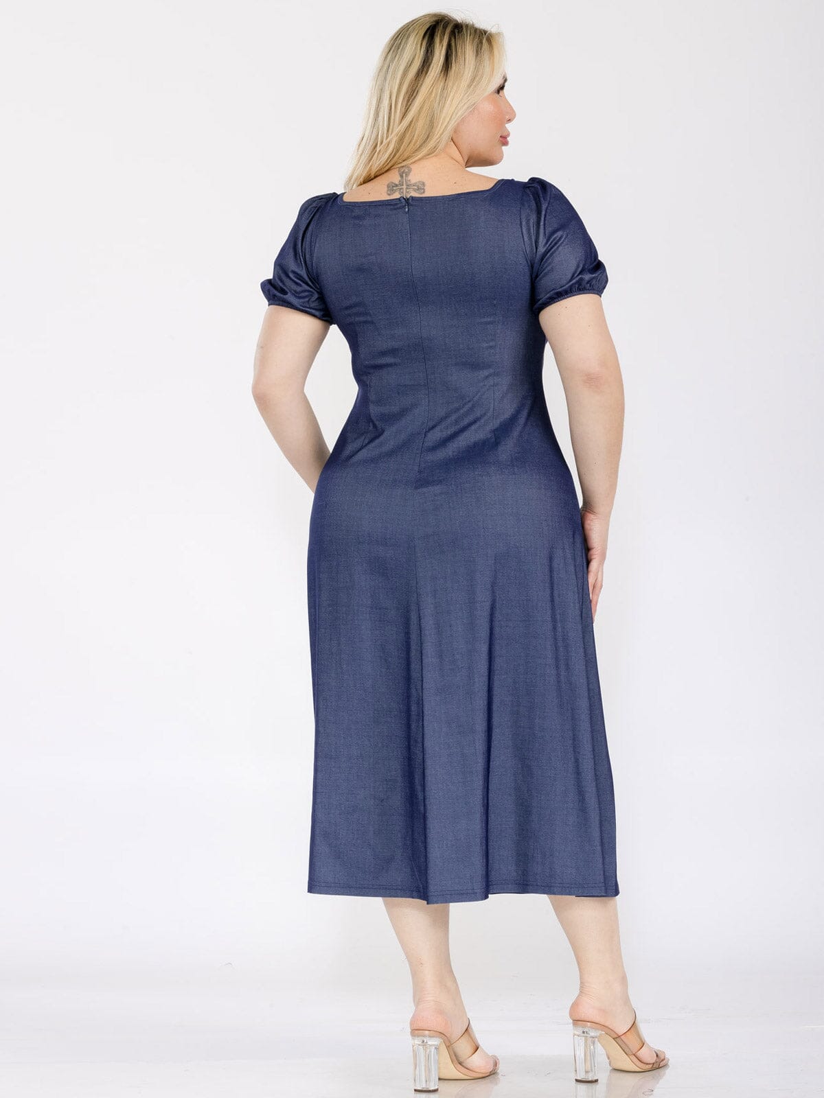 Discover the elegance of this plus-size chambray fit & flare dress. Its flattering midi length and short-sleeve design make it a favorite for casual outings or as a chic office ensemble. Constructed from a soft rayon blend, it offers both comfort and style, ideal for spring and summer collections looking to capture trend-focused consumers.