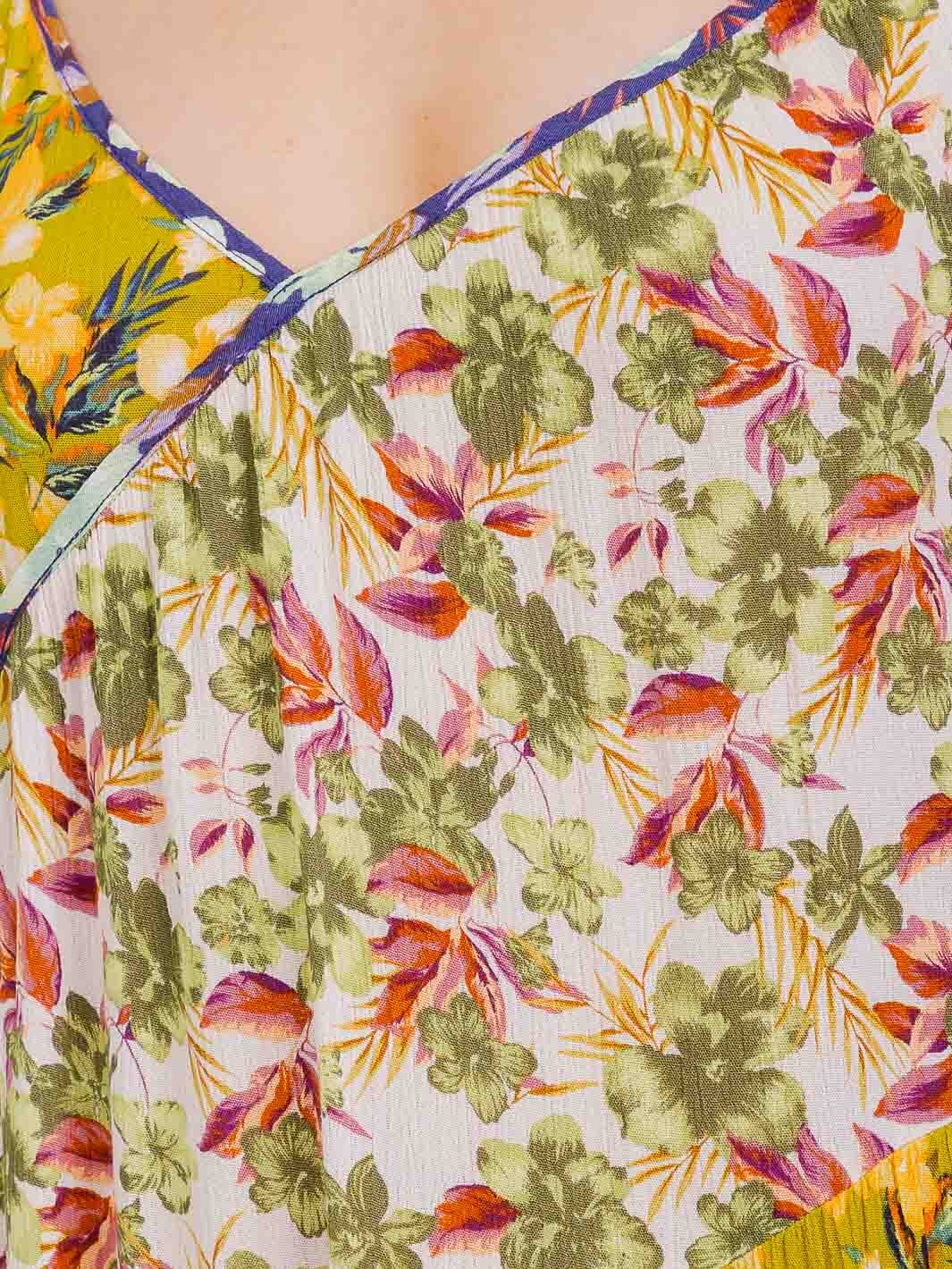 Features:Breathable, elegant fabric, v-neckline, tiered silhouette, vibrant floral print.