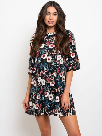 WOMEN'S BLACK FLORAL RUFFLE SLEEVES MINI DRESS
