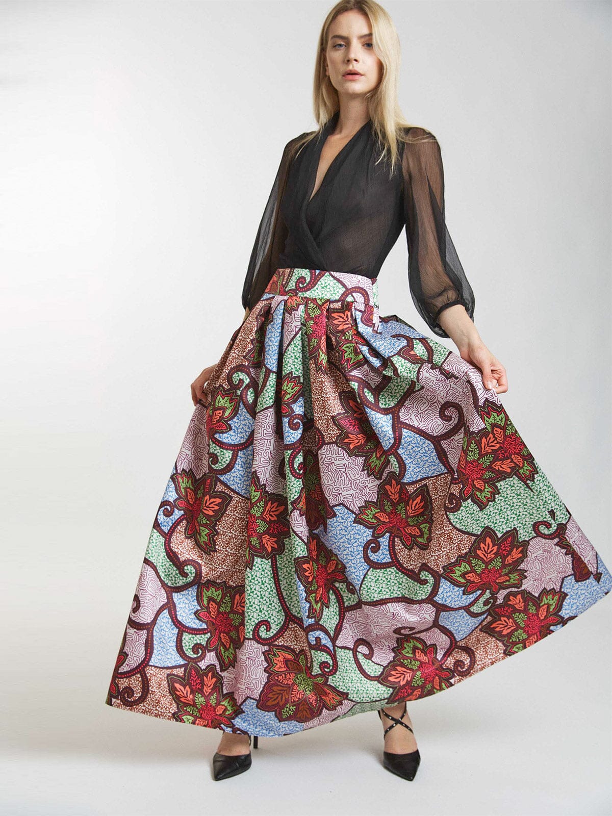 This eye-catching maxi skirt with multi-print details is a favorite among boutique owners due to its strong visual appeal and adaptable styling options. With its competitive pricing and high reorder rate, this skirt promises excellent markup potential and consistently attracts customers both in-store and online. Its vibrant design ensures it stands out in any display, making it a reliable addition to any retailer's collection.