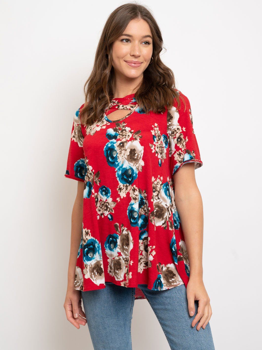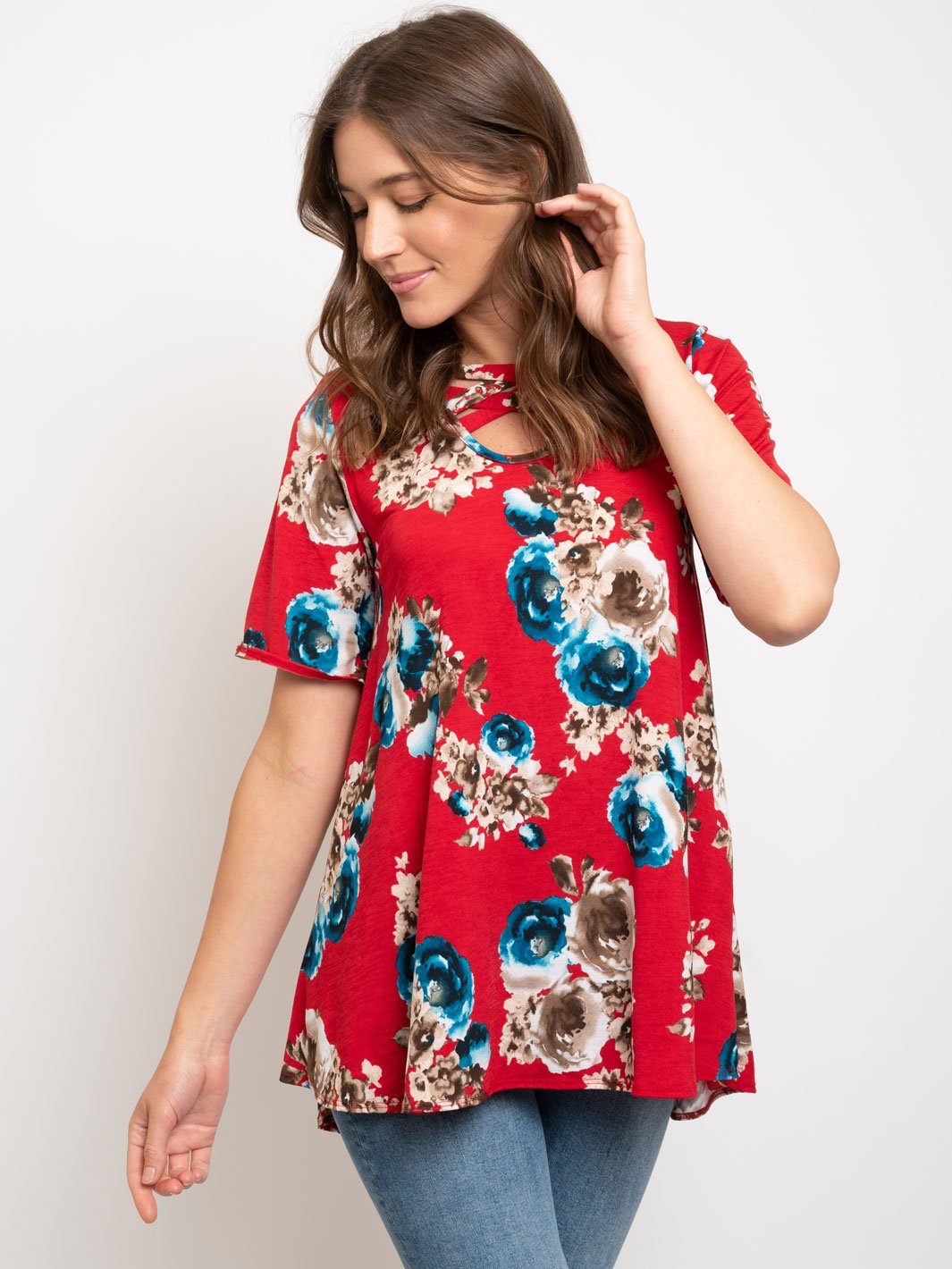 WOMEN'S FLORAL FRONT CROSS TUNIC TOP
